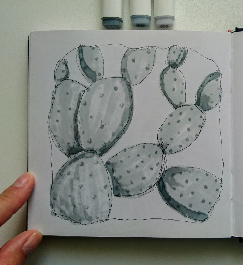 I used second to last page of my beloved sketchbook, a pencil, a couple of fine liners and three green gray TOUCHNEW markers (shades 1, 3 and 5).
