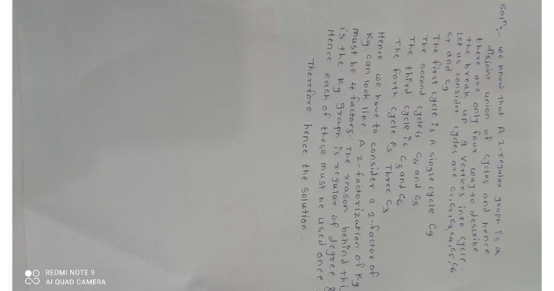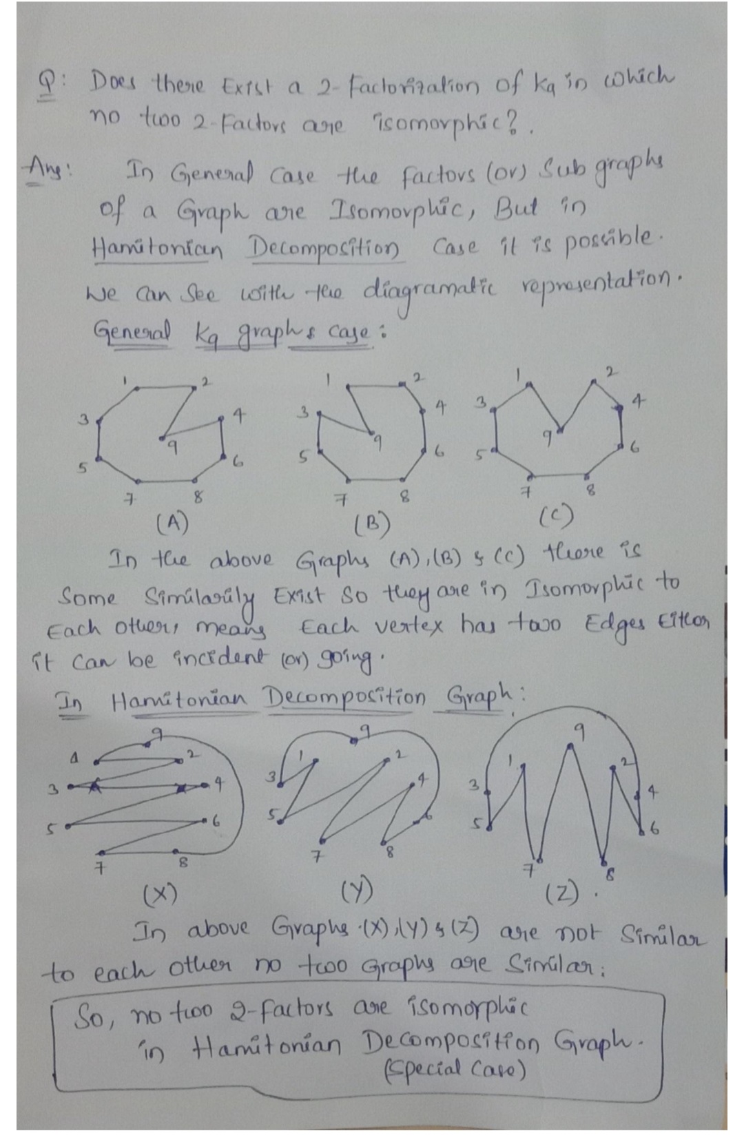 8.32 Does there exist a 2-factorization of Kg in which no two 2-factors are isomorphic?askyip (25)in #askyip • 4 years ago Question : 8.32 Does there exist a 2-factorization of Kg in which no two 2-factors are isomorphic? Answer: images attached