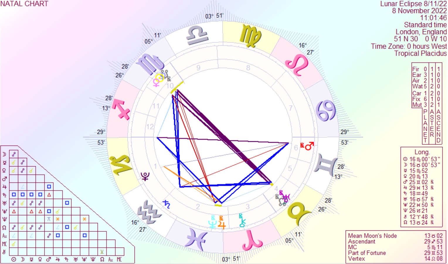 Hi everyone. It's a Lunar Eclipse day today, one of those moments that sets the scene for the weeks and months to come. Lunar Eclipses tend to affect the moods and needs of the people rather than bring significant events to bare upon us, that's the main difference between the two (Solar & Lunar) in my personal opinion. Taking that all into account, then if you look at the chart, and I touched on this in my post a few days ago looking at the US Midterm elections on my Facebook page, the feeling within us all will be one of sensing that in some way, it's time to move and and in the same moment push on from past situations that might have been causing problems or holding us back.