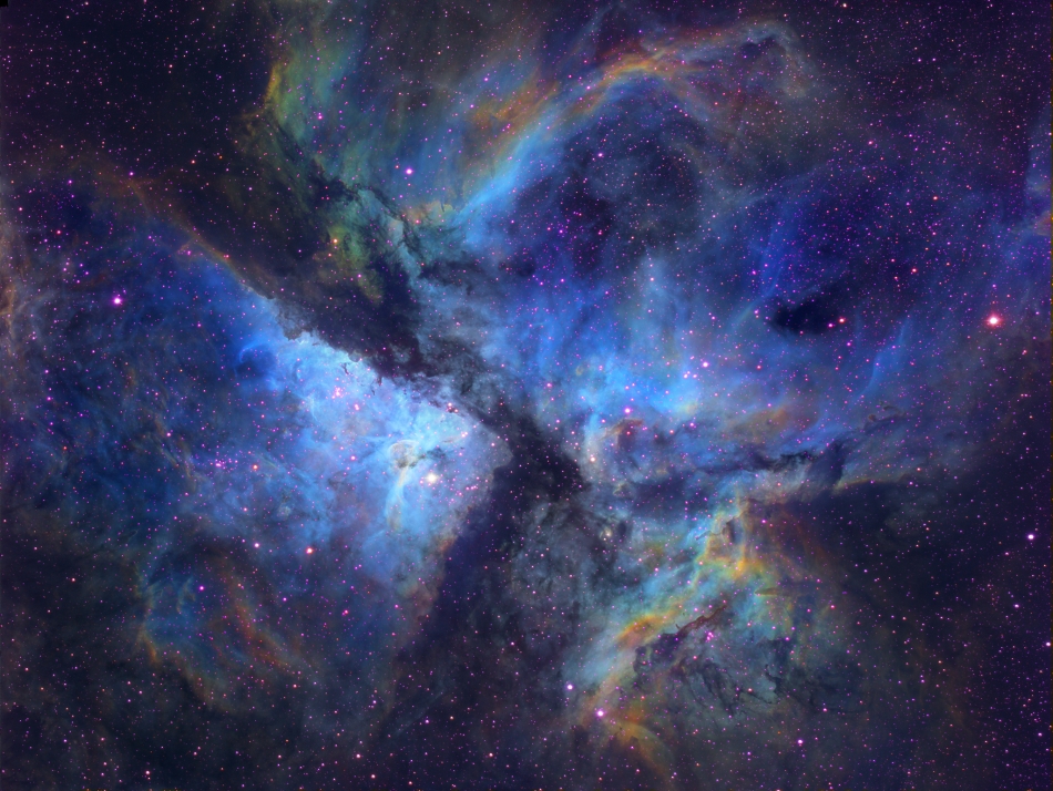 Shot of Carina Nebula in narrowband filter to highlight the ionized oxygen being blown into deep space by the hot stars in its core. The oxygen here is featured as blue, while the greenish red areas at the extremities are hydrogen. Most shots of Carina are generally reddish-magenta in hue as that is the natural colour of ionized hydrogen. See later photos in this article for an example.
