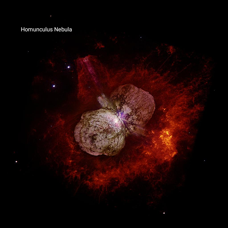This eruption is considered in its own right a nebula named the Homunculus Nebula. And it encases entirely Eta Carinae. When you look at images of most nebula you assume that they took eons to form, but Homunculus only took five years. One of its lobes is facing generally towards earth while the other facing away. Because of this the lobe expanding in our direction is blue shifted in hue while the other racing away is red shifted. What you see in photos of Homunculus is literally the actual explosion. One day it will eventually dissipate into the more soft and amorphous form we tend to think of nebulas as looking like. But before then, in about ten years time, Eta Carinae is expected to grow so bright that spotting Homunculus through the star's glare will be very difficult for astronomers.