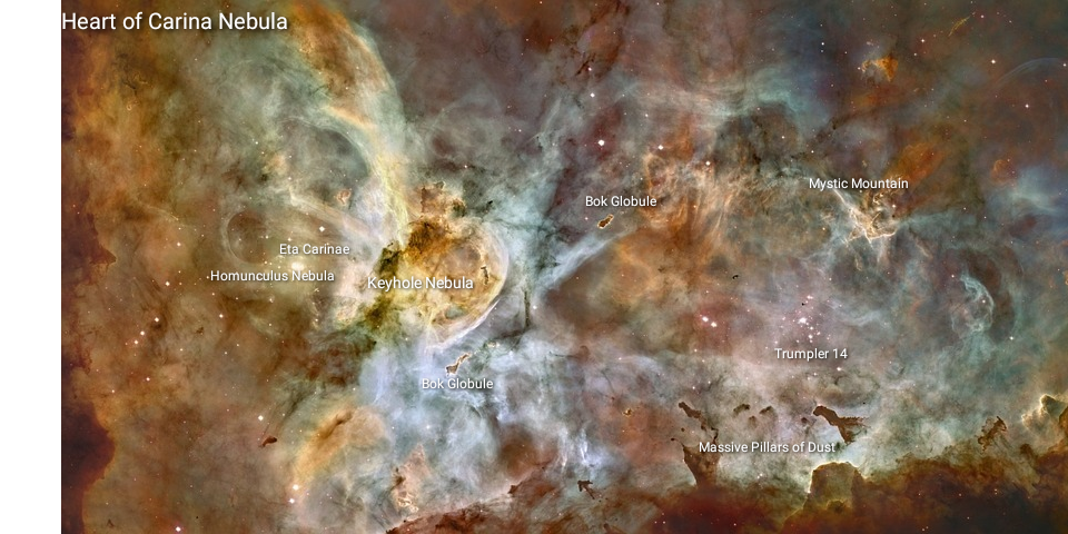 Scattered like lonely islands throughout the Carina Nebula you'll notice in pictures dense black clouds of stellar dust called Bok Globules. Named after the alliterative Bart Bok who first observed them back in the 1940s, Bok Globules are cocoons for young fledgling stars and serve as little private stellar nurseries for them. These Bok Globules being dense and cold are like harbours protecting the delicate young stars from the harsh solar winds and radiation that might otherwise strip them of the vital material they need to continue growing.