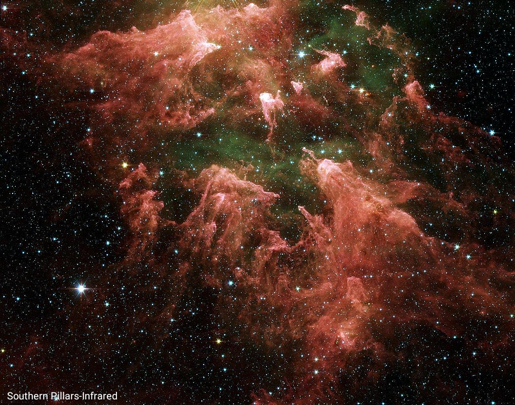 An infrared shot of the Southern Pillars. The baby stars appear yellow surrounded by pink dust while the hot interstellar gasses are seen as green. The blue stars are in the foreground of the shot and not part of the actual nebula. Just out of the shot near the top would be Eta Carinae. Notice the dust pillars are being blown like a comets tail away from the direction of Eta Carinae and the powerful solar wind and radiation it emits