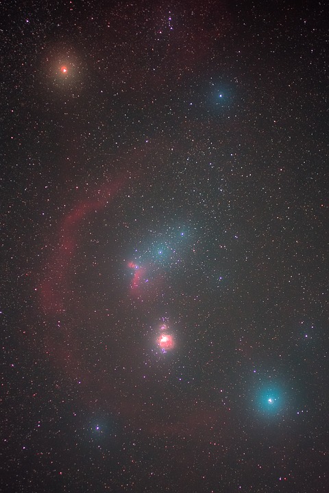 Orion hosts several famous stars that are so large that their true size is hard to fathom. Forming the hunters right shoulder (left upper corner of hourglass from the viewers perspective) is a red supergiant thats been in the news recently called Betelgeuse (Alpha Orionis). Burning stoplight red in the night sky Betelgeuse recently has been observed dimming in intensity. Astronomers cant be entirely sure, but they do know this is exactly what Betelgeuse is expected to do just before she expires in a blaze of glory known as a supernova. When she eventually does, she will momentarily for a few weeks shine brighter than the moon in the night sky. As amazing as this occurance will be when it happens it could be anytime between now and the next 100,000 years. Which in universal time spans is basically any moment. Luckily earth will be safe since Betelgeuse is located 624 light years from earth. But the left over gasses and debris will one day form the closest nebula to our home star system complete with a stellar nursery birthing newborn stars inside. The nebula will forever alter the night sky and be a beautiful addition to all of our evening vistas.