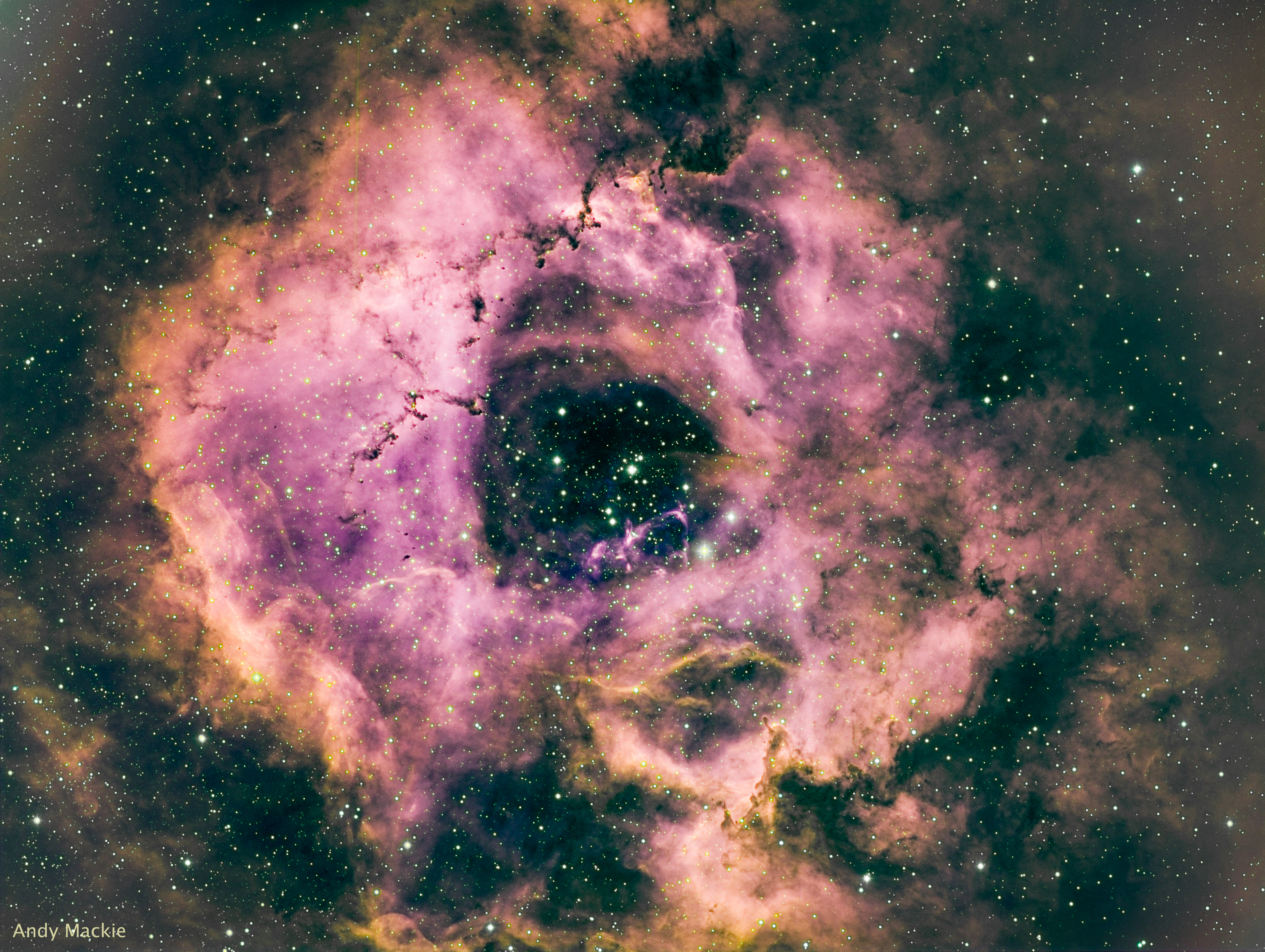I attach an example that I took from my backyard in Perth, Australia, which is of the Rosette nebula, a total of 28 x 30 minute exposures using a combination of 3 narrowband filters (Hydrogen alpha, Oxygen and Sulphur) to give a series of black and white pictures which I then combined in software called Pixinsight to give a colour rendition, with a little polish in Lightroom.