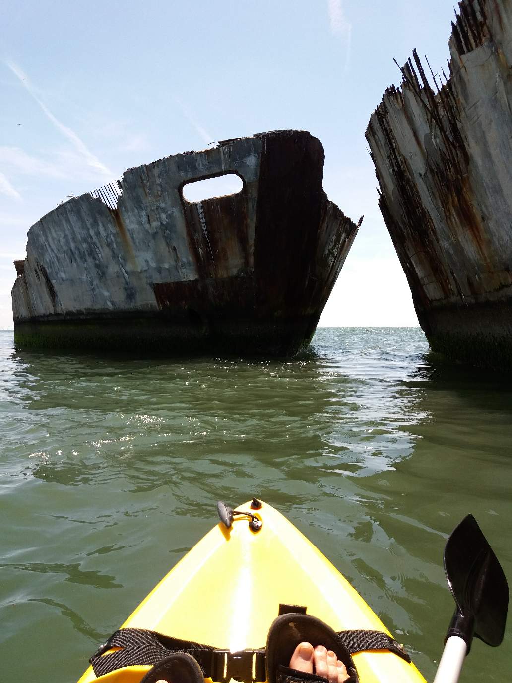 "This is the bow of one abandoned concrete ship and the stern of another. They were deliberately grounded in about ten feet of water to make a protective breakwater for a ferry dock."