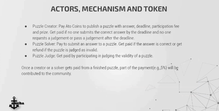 There are 3 kinds of actors in Atocha, there is three types of actors in Atocha. The first is, puzzle creator, the pay Ato coins to create, publish a puzzle and define the right answer, the deadline participation fee and put their own Ato coins as price. If no one, get some means, the correct answer by the deadline, and the no requests a judgement, participation fee will give the puzzle creator as a reward.