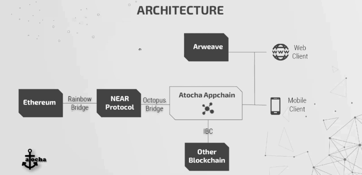 Here is our technical systems structures, Atocha Captain will interact with people with mobile client or web client. And we use inter blockchain, communication protocols.