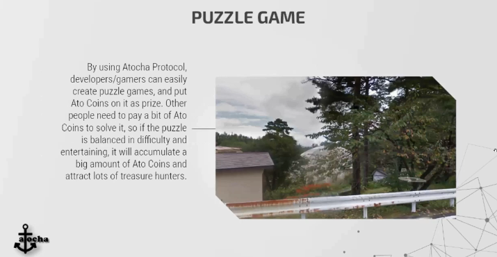 by using Atocha protocol gamers can easily create puzzle games put other coins, other coins is our token. Alright, as price, other people need to pay a little bit Ato coins to solve it. So if the puzzle is designed balanced in difficulty, and entertaining. It will accumulate it a big amount of other coins and attract lots of treasure hunters.