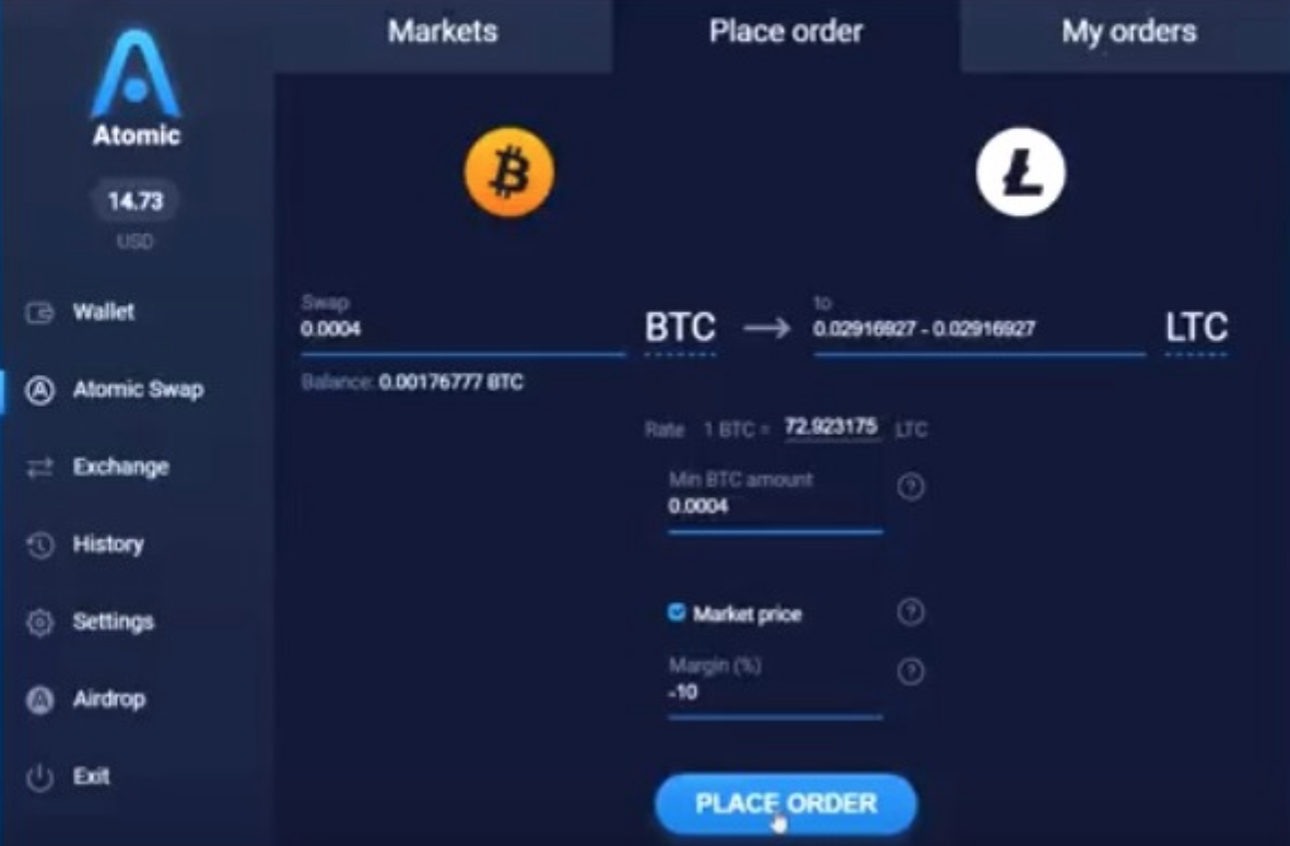 В разделе Atomic Swap доступен прямой рыночный обмен между сторонами без посредников. Все что нужно здесь устанавливать – это количество монет к обмену и необязательную маржу.