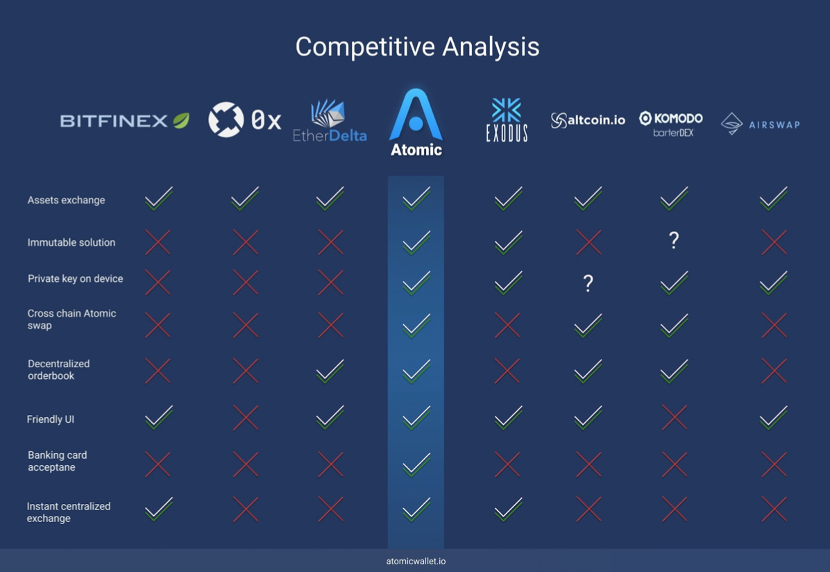 Среди основных конкурентов Atomic Wallet стоит обратить внимание на таких, как Bitfinex, Exodus, Altcoin, Komodo, Airswap и некоторых других менее известных.