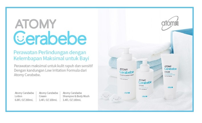 Atomy Cerabebe 3 set dalam satu set mengandungi 3 macam produk jenisnya adalah,Atomy Cerabebe Lotion 200ml, Atomy Cerabebe Cream 100ml dan Atomy Cerabebe Shampoo serta Body Wash 350ml. Atomy Cerabebe lotion berfungsi menyerap lembut kedalam kulit tanpa memimbulkan iritasi dan menjaga kulit tetap lembab.