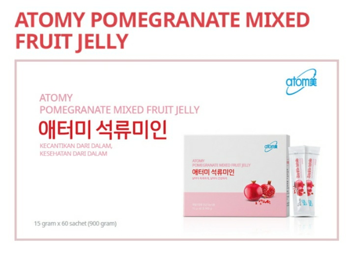 Atomy Pomegranate Mixed Fruit Jelly merupakan bahan alami untuk kecantikan dari dalam yang terbuat dari buah delima merah asli sehingga mendapat kan kulit sehat dan putih alami