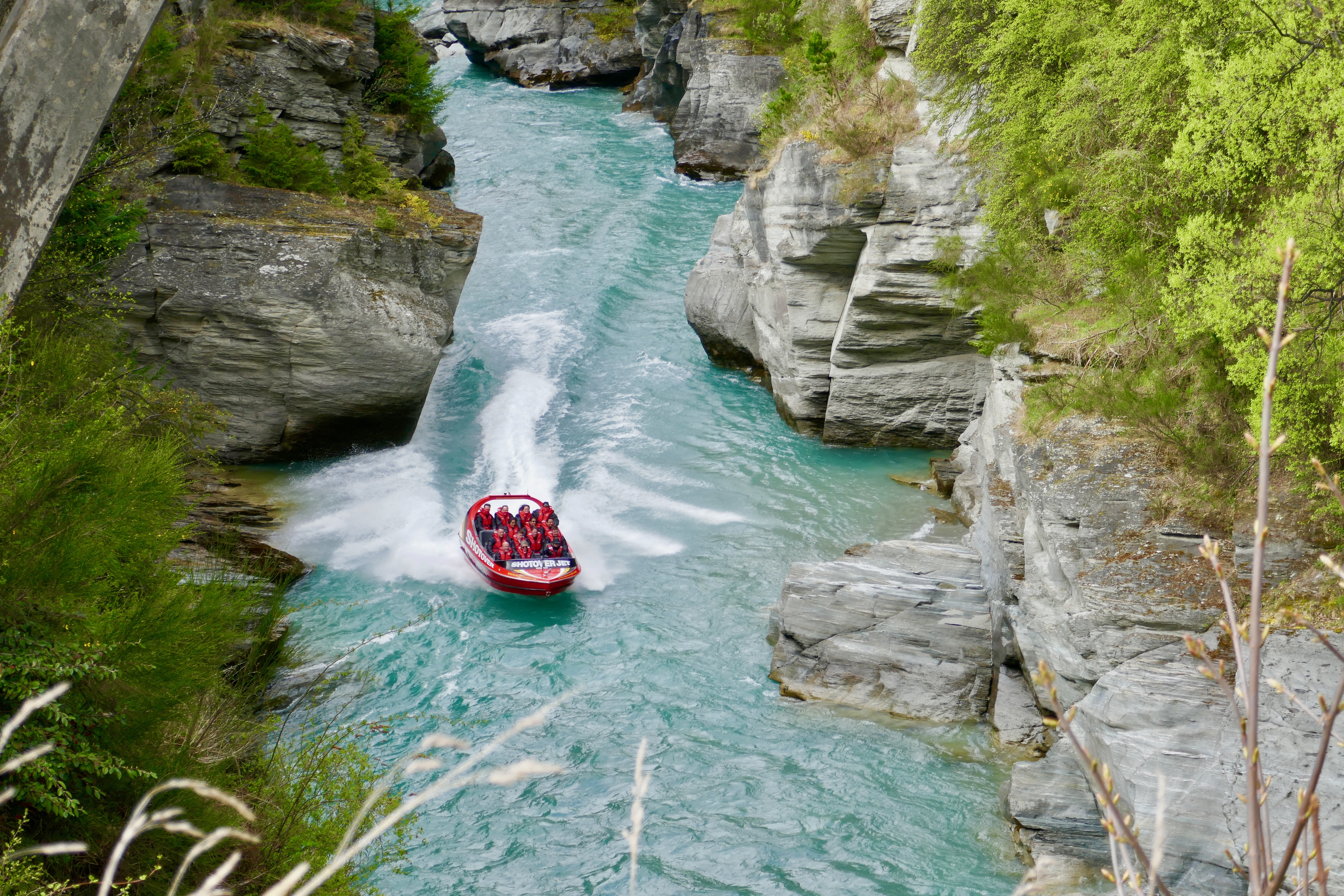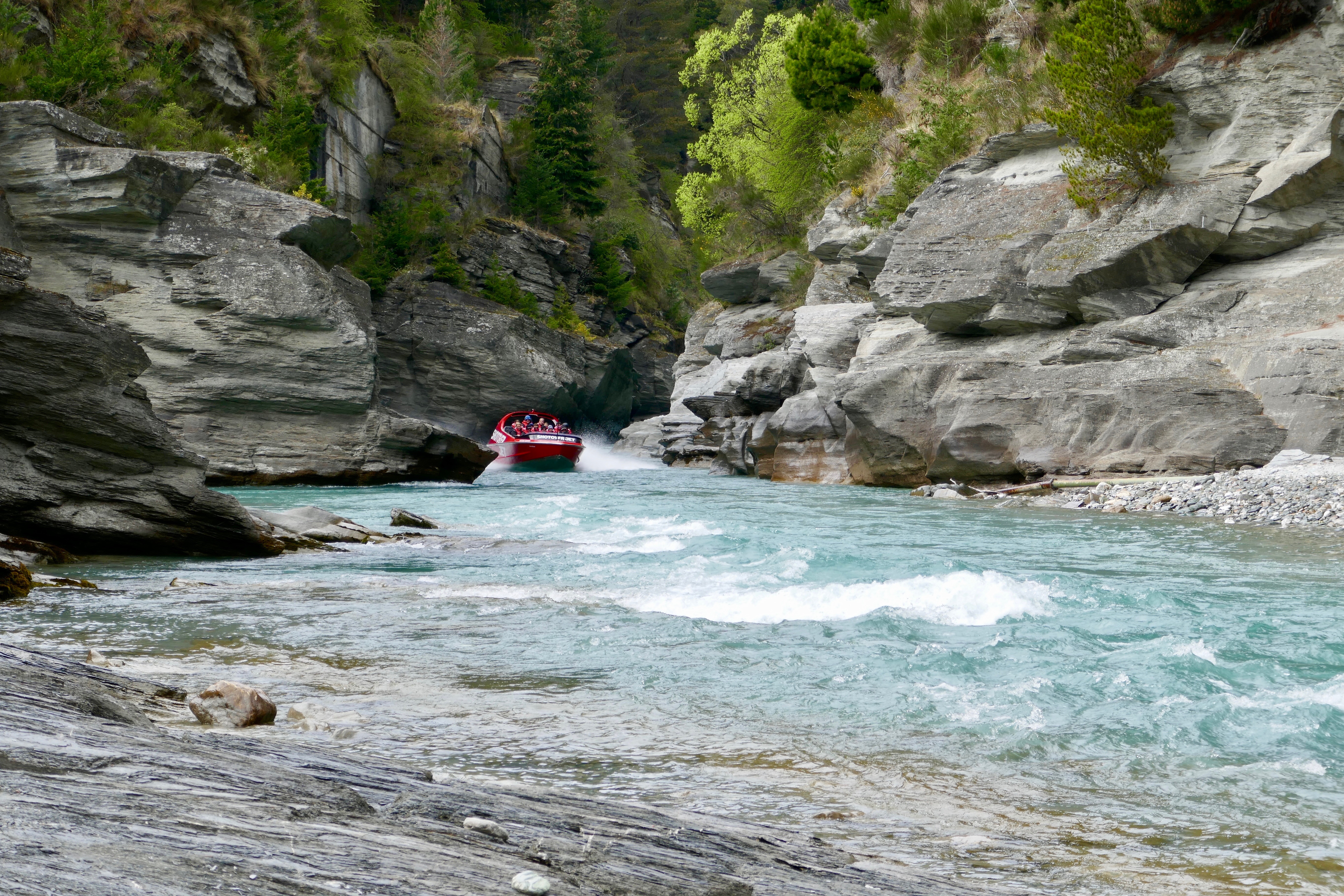 Now that's a great experience. I've been riding motor boats(from 100 to 200 hp) pretty often for almost two years but such ones never and of course never on such a river. One should be very skilled to do that fast near these cliffs but I guess the drivers have thousands of hours on that river. Pretty expensive the ride but since you're in vacation and it's not something you have as a daily experience it's worth it. The pics are great and so seems New Zealand. Have fun!