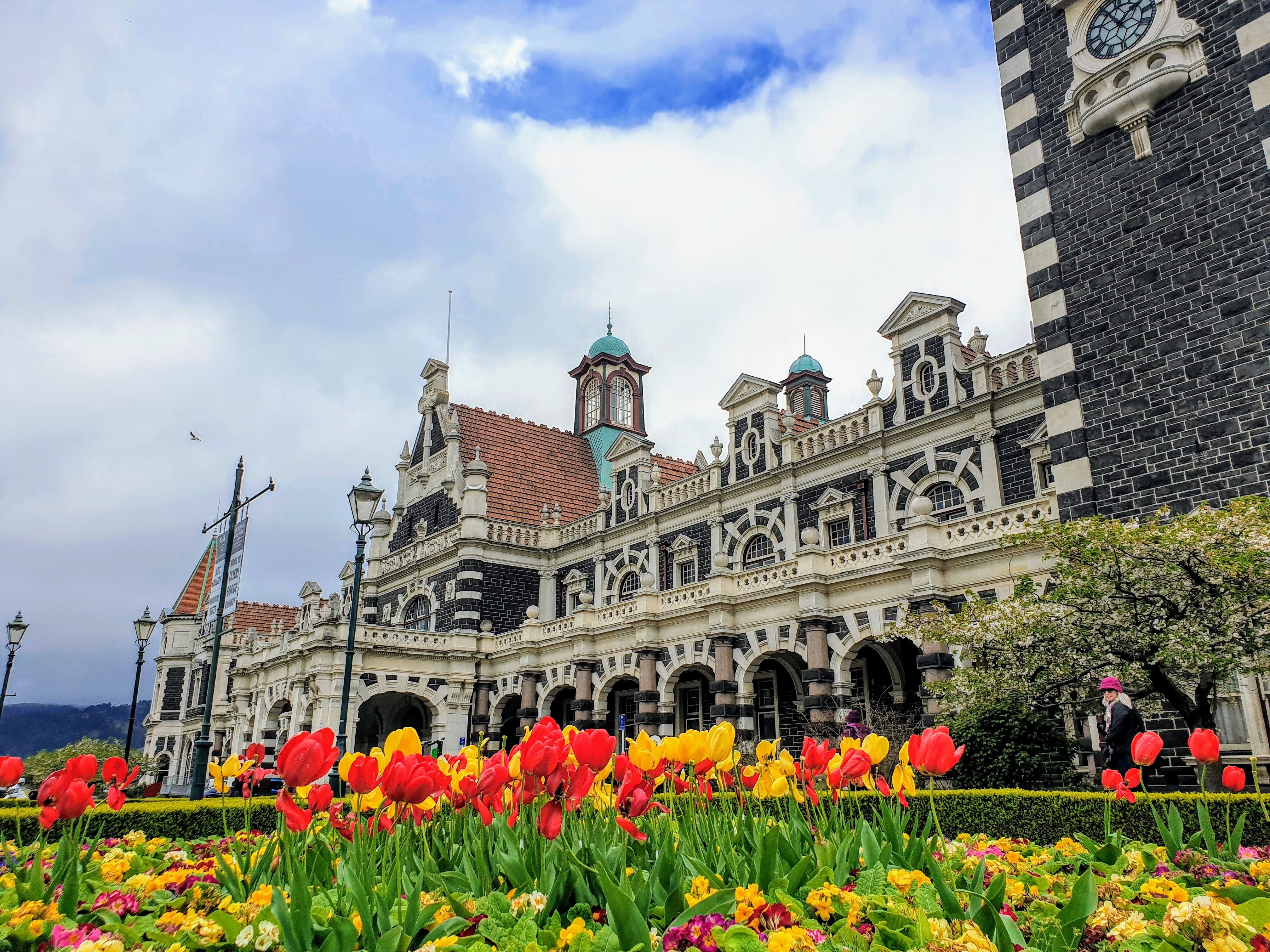 Once the locomotive was reset at the front of the train [the front which used to be the back], and with passengers back on board, the train heads back to the Dunedin train station which you can see pictured here below. It's one of the most photographed train stations in the world. It was built in the Flemish Renaissance style using two local stones being the dark volcanic stone from Kokonga and limestone from the Oamaru area. The area out the front of the station is known as ANZAC Square, so-named after the Australian and New Zealand forces which served together in World War One (1914-1918).