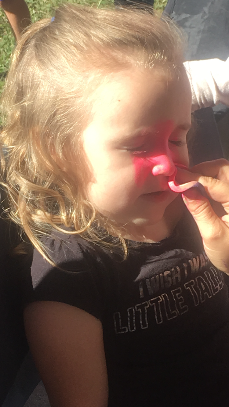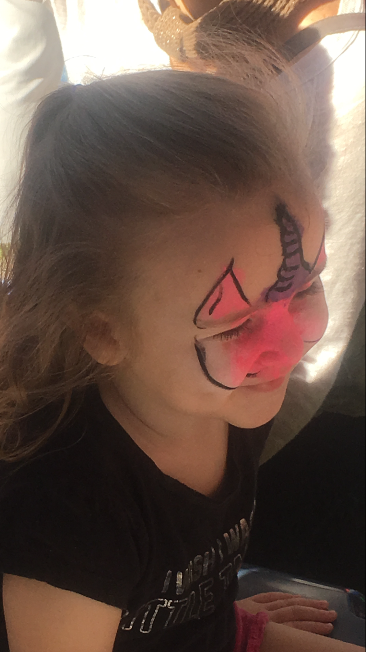 We then went back over to wait for her sister to be turned into a unicorn. Full credit to Miss 3, she does not like to be touched as you can see in the photo but she was very brave and sat still so she could have it finished.