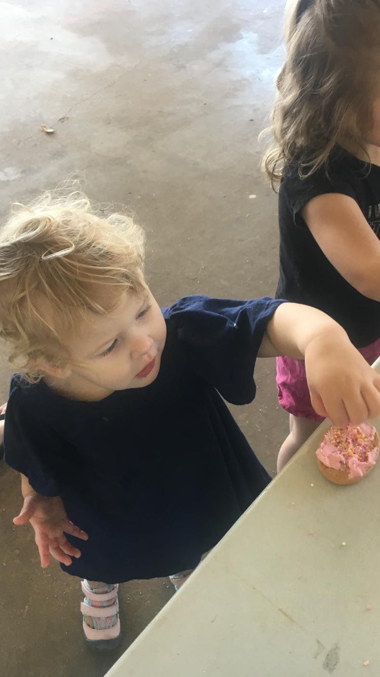 Miss 1 and Miss 3 both had to have the pink strawberry frosting on their cookies, with a little help from mum, then they were onto the sprinkles. They of course made a huge mess as did all the other kids but it was all part of the fun!
