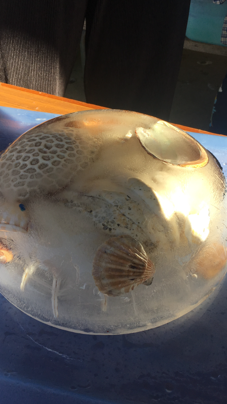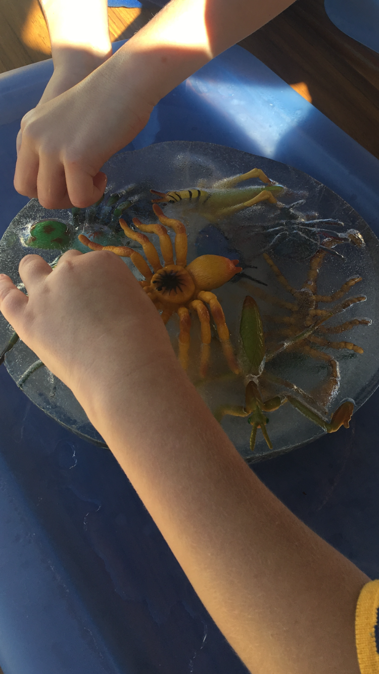 The next activity was playing with the frozen blocks. They had two giant water ice blocks, one filled with shells and beach items and the other with rubber insects. This was a big hit although the kids were frustrated that the ice would not melt faster.