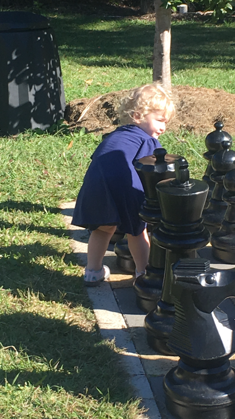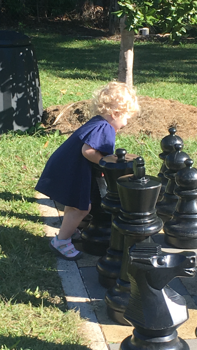 After morning tea Miss 1 discovered the giant chess set. Although none of the children new how to play the game they were having an absolute hilariously fun time trying to move the pieces around he board. Miss 1 in particular looked very funny as the pieces were as big as she was.
