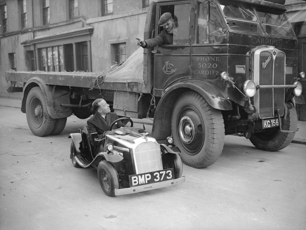 Dialogue of truck drivers and runabouts in Cardiff, Great Britain, 1935. Something like: "Do not be confused under your feet - I'll crush!"