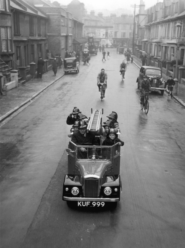 A miniature copy of a fire truck on the streets of Brighton, England. The car is half the original, on May 5, 1951.