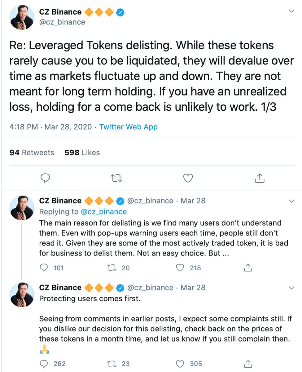 12/05/20 01:19 47 PM Retweet: So are we not going to talk about Binance quietly listing their own leveraged tokens a month and a half after delisting FTX's leveraged tokens? Are we not going to talk about CZ claiming it was because he wanted to protect users? pic.twitter.com/e5DJssaks8