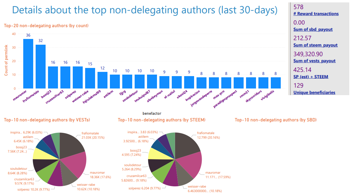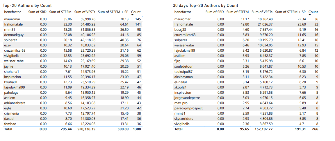 Details about beneficiary rewards to the top authors (by count) / 30 days