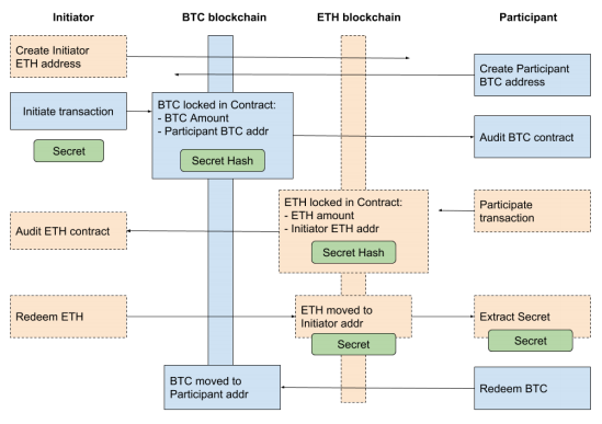 As enshrined in the whitepaper, Atomic Swap Wallet renders a robust on-demand service that empowers users to overcome the costs consumed by managing the assets of their cryptocurrencies and eliminates the need for middlemen. It provides a powerful on-demand service that allows users to reduce the costs associated with managing the assets of the encryption currency and make it transparent and reliable. Atomic Swap supports cross-chain, which is an exchange of cryptocurrencies between users. This basically implies Mr. Bean sends coin E to Mr. James wallet address via the blockchain, while Mr. James performs the same action for Mr. Bean, both actions happening independently on parallel blockchain, in a one-way manner. This is the exact technology behind Atomic Swap. It eliminates the need for a third party or middleman. The diagram below describes the process;
