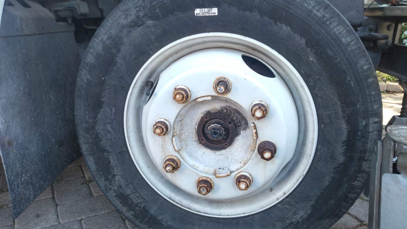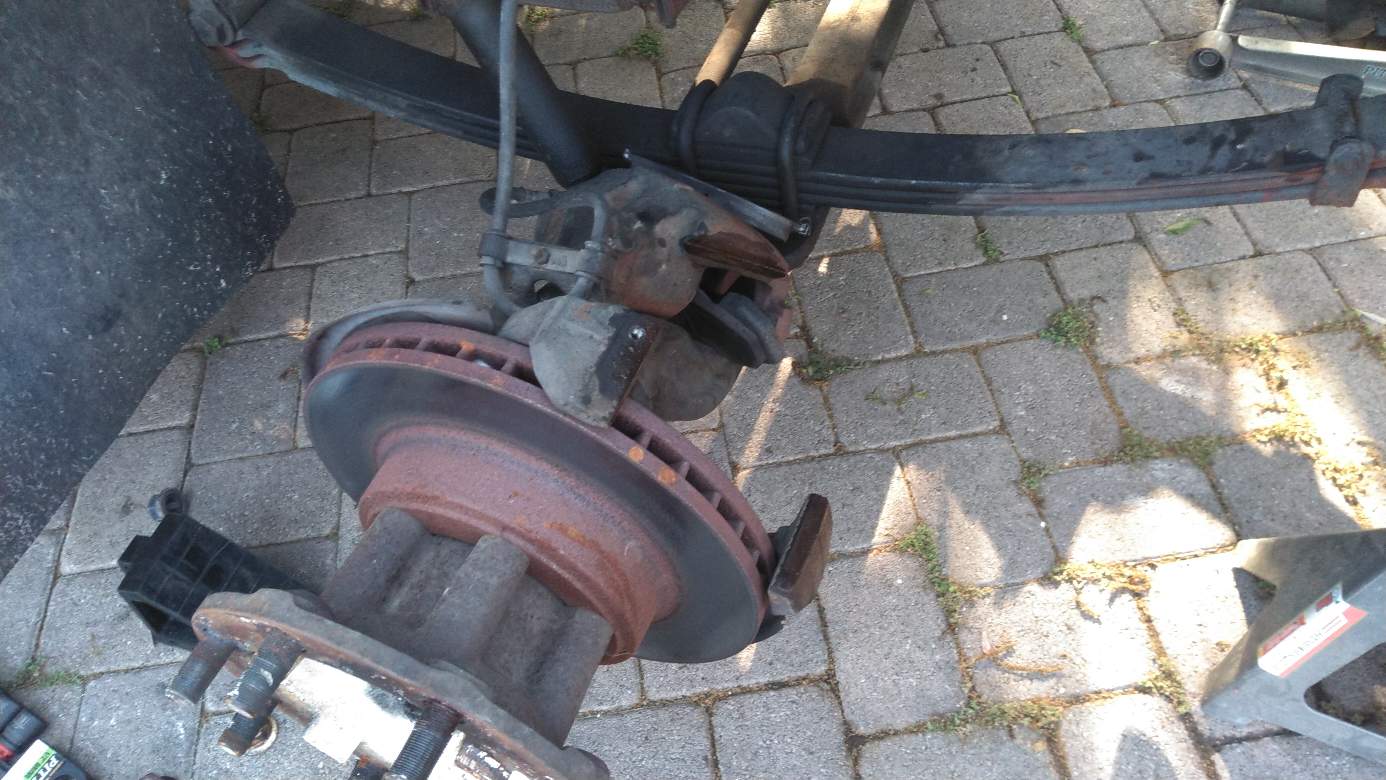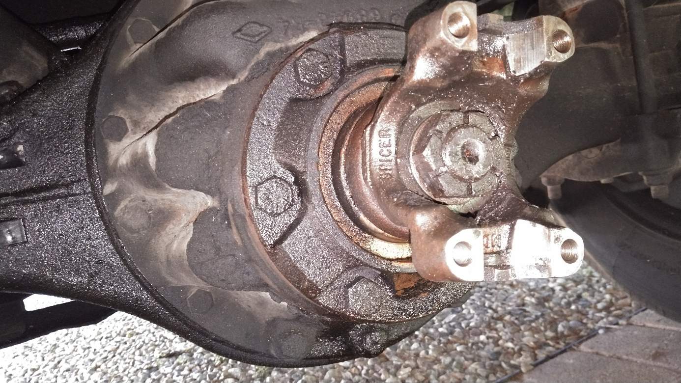 Next up was to check the wheel bearings on the front axle. I know this is an often neglected maintenance item, so I at least wanted to check that the bearings were tight and that there was good looking grease in them. First I had to get the wheel lug nuts off and let me tell you, this was one hell of a herculean effort. Somebody must have taken a five foot breaker bar to them because a couple would not budge with the three foot cheater bar I cobbled together. On the two most stubborn ones, the breaker bar started to bend at its swivel and on the second one it split the socket.