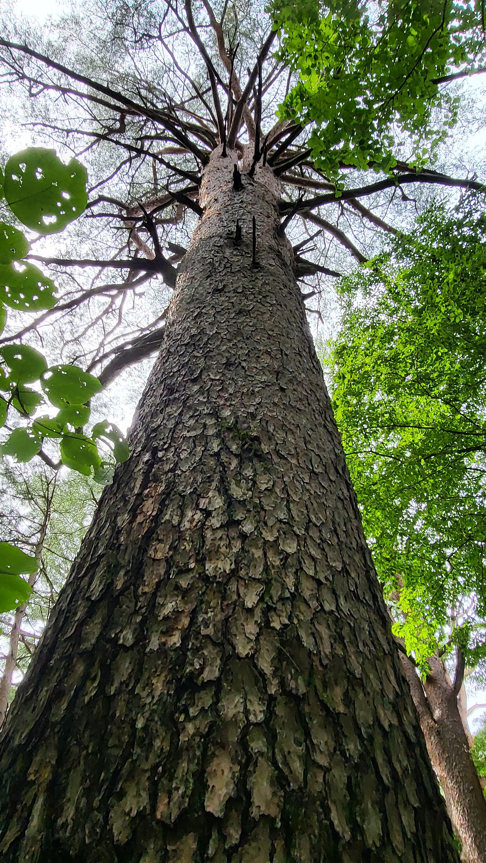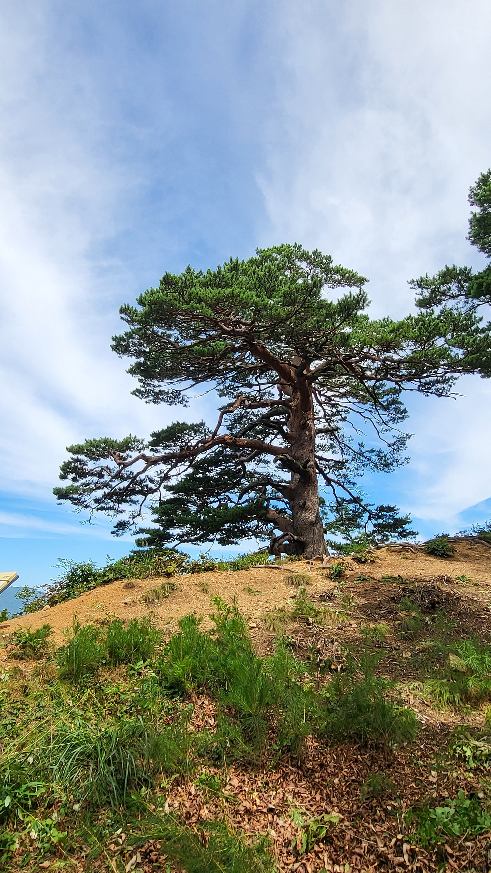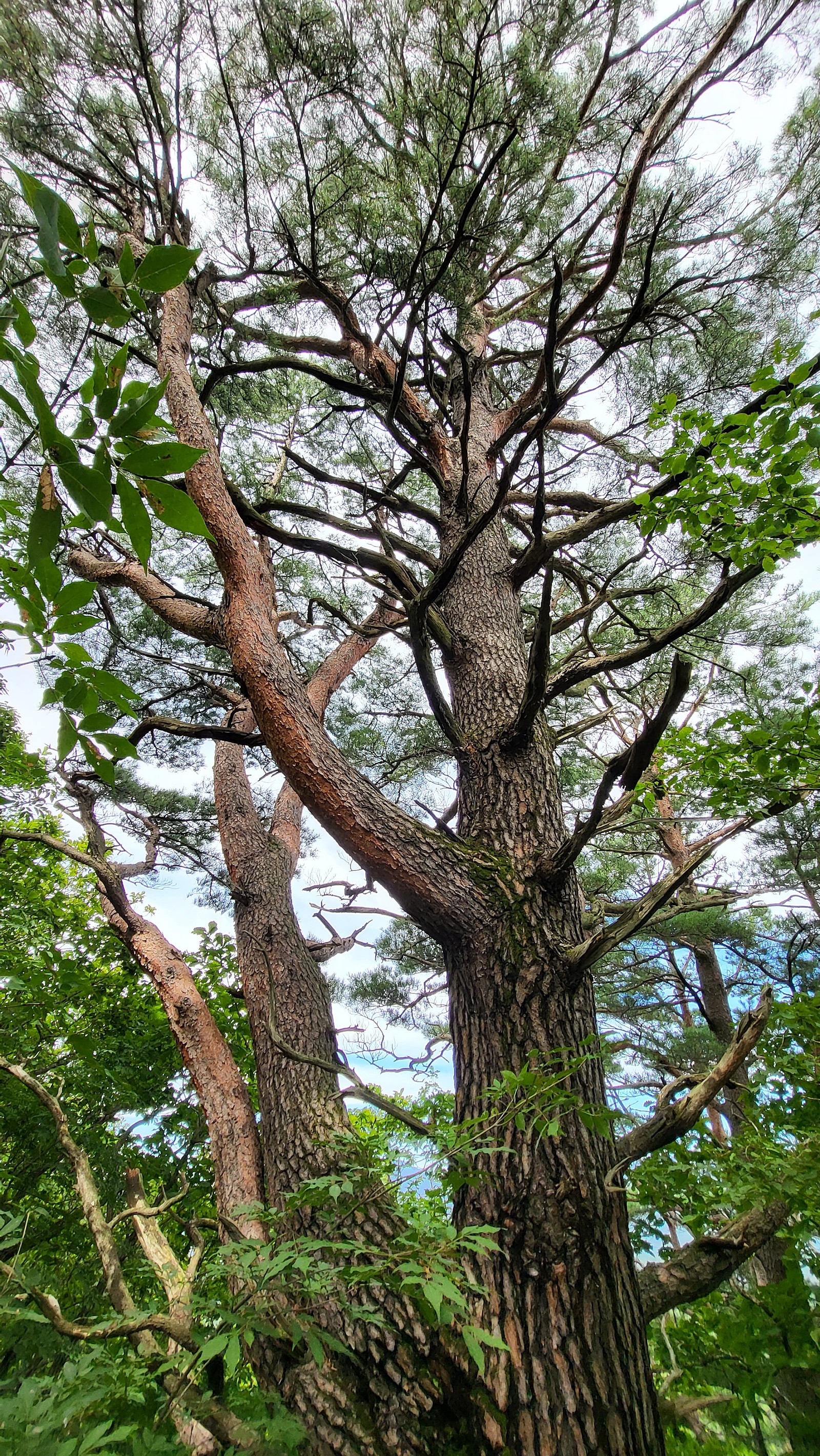 오백년소나무를 지나니 숲 해설사가 산비탈에 선 소나무를 가리킨다. 수령이 약 520년 된 못난이소나무다. 오백년소나무처럼 쭉 뻗지 못하고, 중간에 둘로 나뉜 가지가 구불구불해 못난이란 이름이 붙었다. 그런 생김새가 오히려 더 정이 간다.