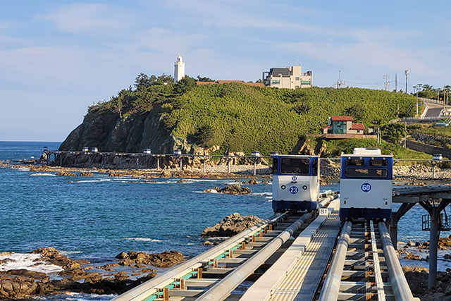 다음 날은 ‘숲의 바다’서 나와 진짜 바다를 만날 시간이다. 죽변항서 죽변해안스카이레일을 타면 하트해변과 죽변등대, 드라마 〈폭풍 속으로〉 세트장 등 수려한 해변과 명소를 감상할 수 있다. 자동으로 움직이는 무인 모노레일이 죽변항부터 후정해변까지 2.8㎞ 구간을 시속 5㎞로 달린다. 모노레일이 생각보다 작아 귀엽다. 느리게 움직이는 모노레일서 커다란 유리창 밖으로 시리도록 푸른 바다를 감상하는 맛이 일품이다.