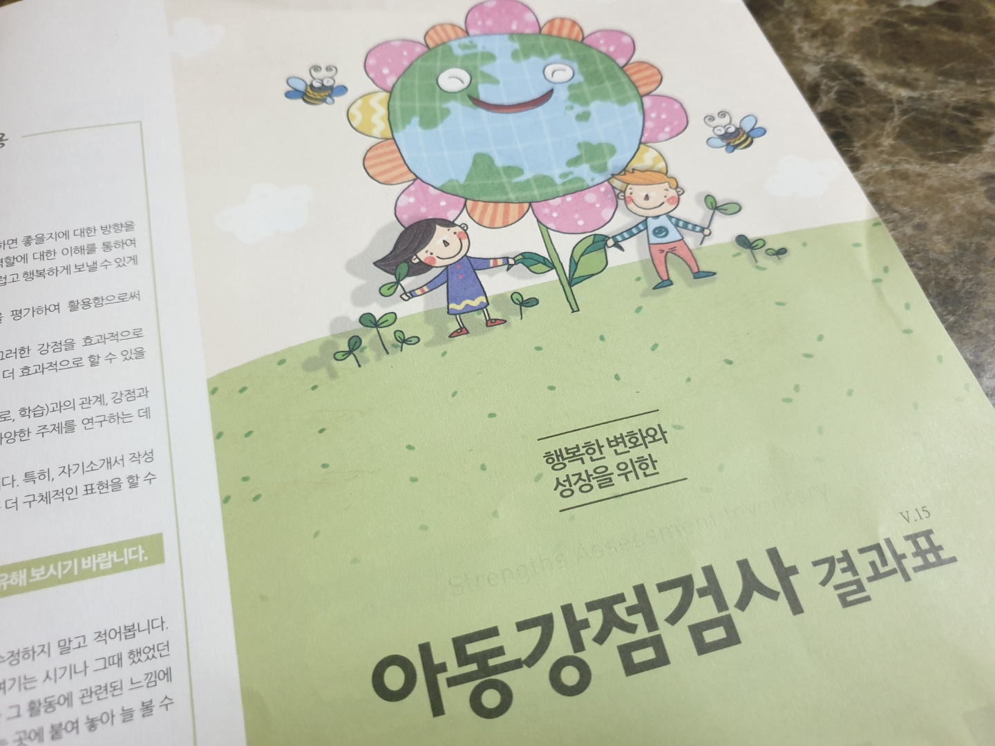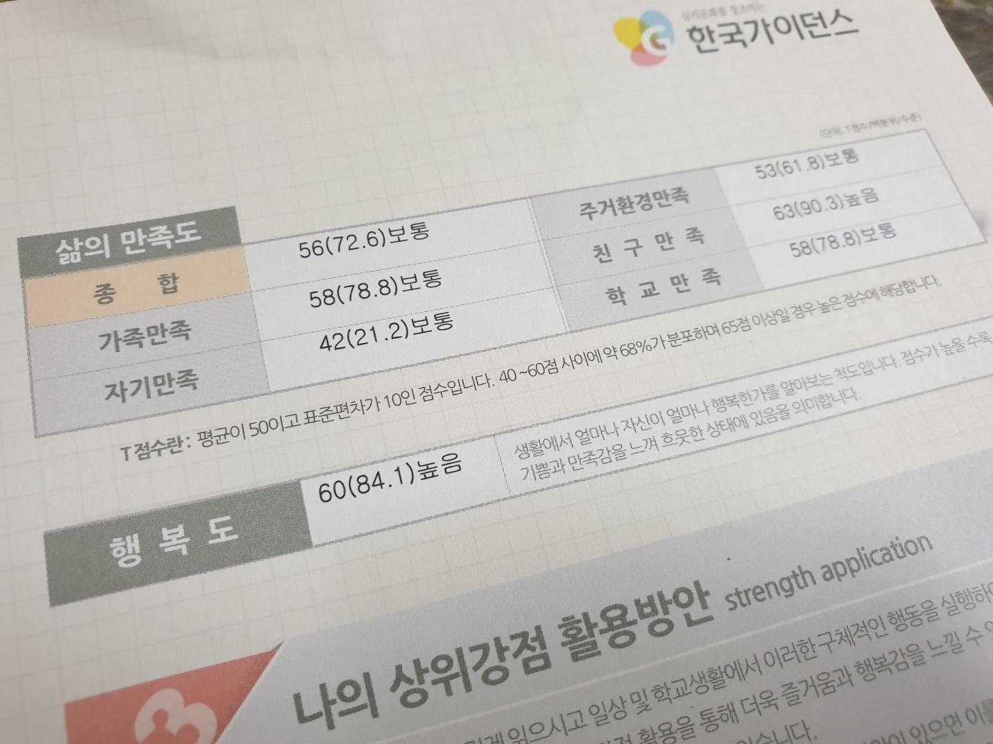결과표에는 아이의 강점과 삶의 만족도, 행복도.