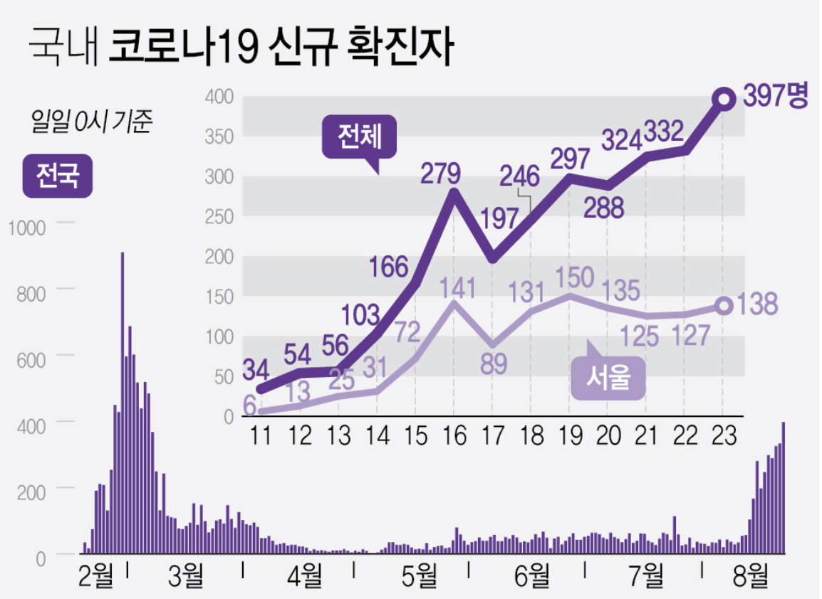 8월 11일 이후 서서히 증가하던 확진자는 8월 11일 34명에서 12일 하루만에 54명으로 증가했다. 그러다가 13일 56명에서 14일 103명으로 증가했다. 8월 13일에는 397명으로 늘어났다.