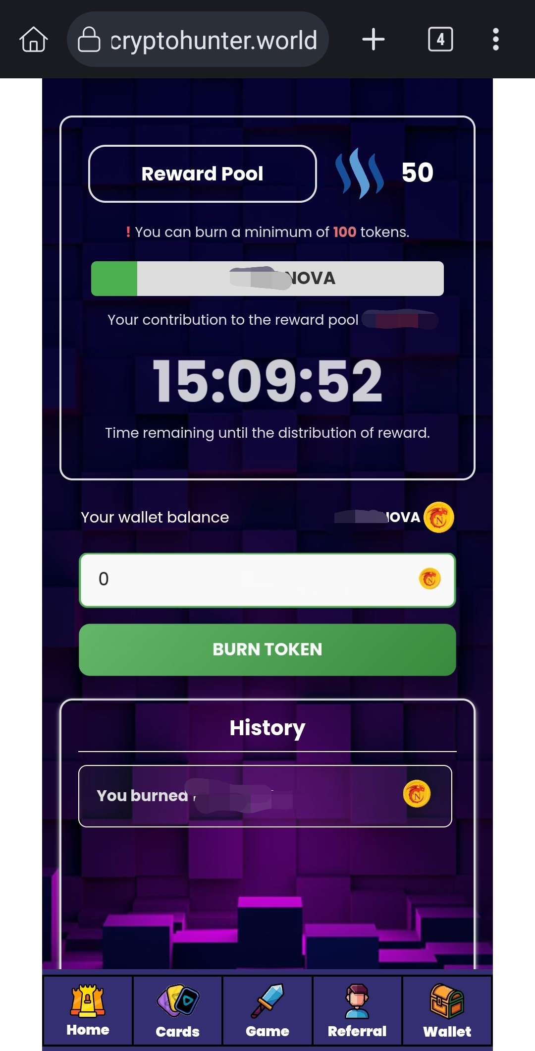 위 사진은 NOVA 소각 시스템이 작동 중인 화면입니다. 100 NOVA 이상부터 참여할 수 있고, 남은 시간 카운트다운이 긴장감을 더해줍니다. 마치 시계 태엽이 감기듯, 시간이 차오르면 보상 풀의 문이 열리는 구조입니다.