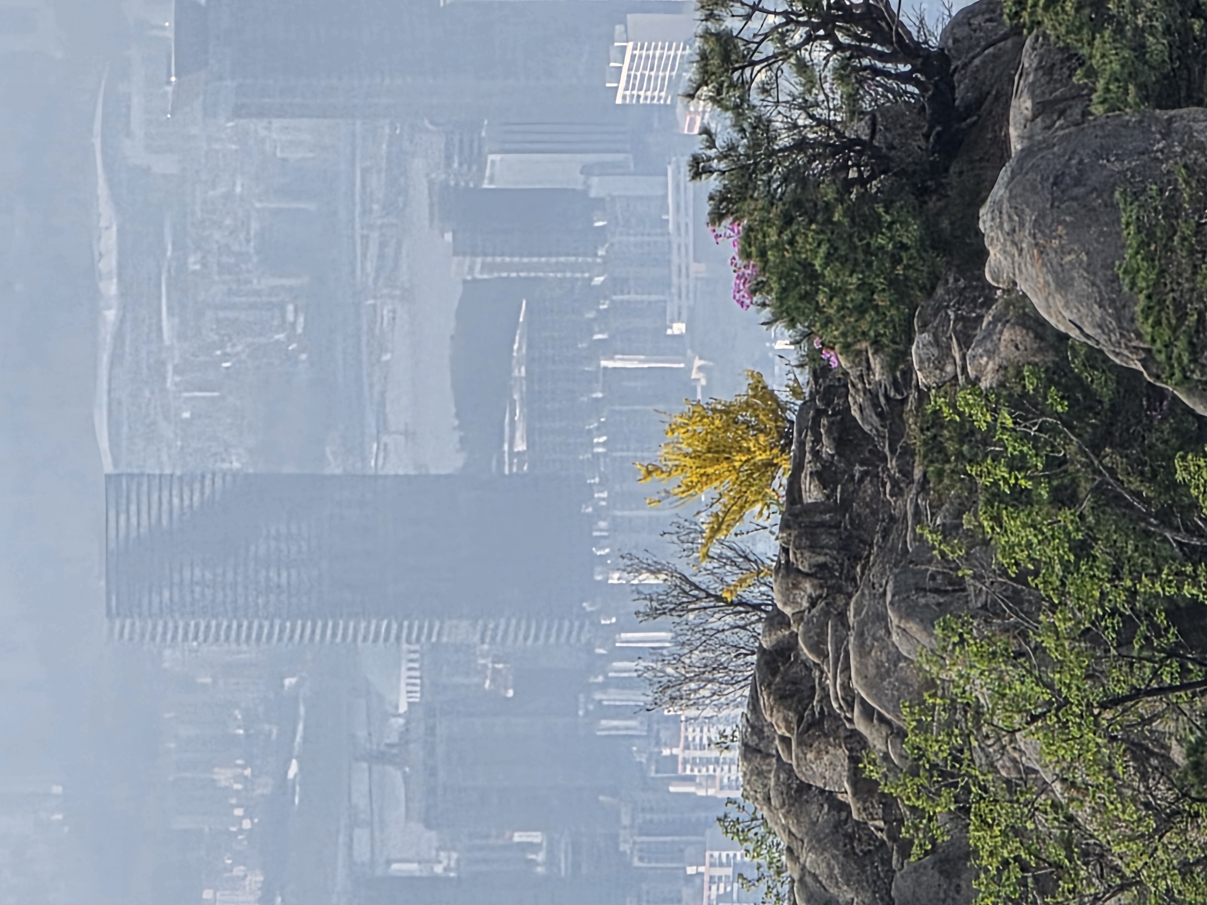 약 해발 620m 높이에서 내려다보는 도심은 안개에 싸여 신비롭고, 그 앞에 생명력 있게 돋아난 꽃은 척박한 바위산의 봄을 따스하게 감싸주네요.