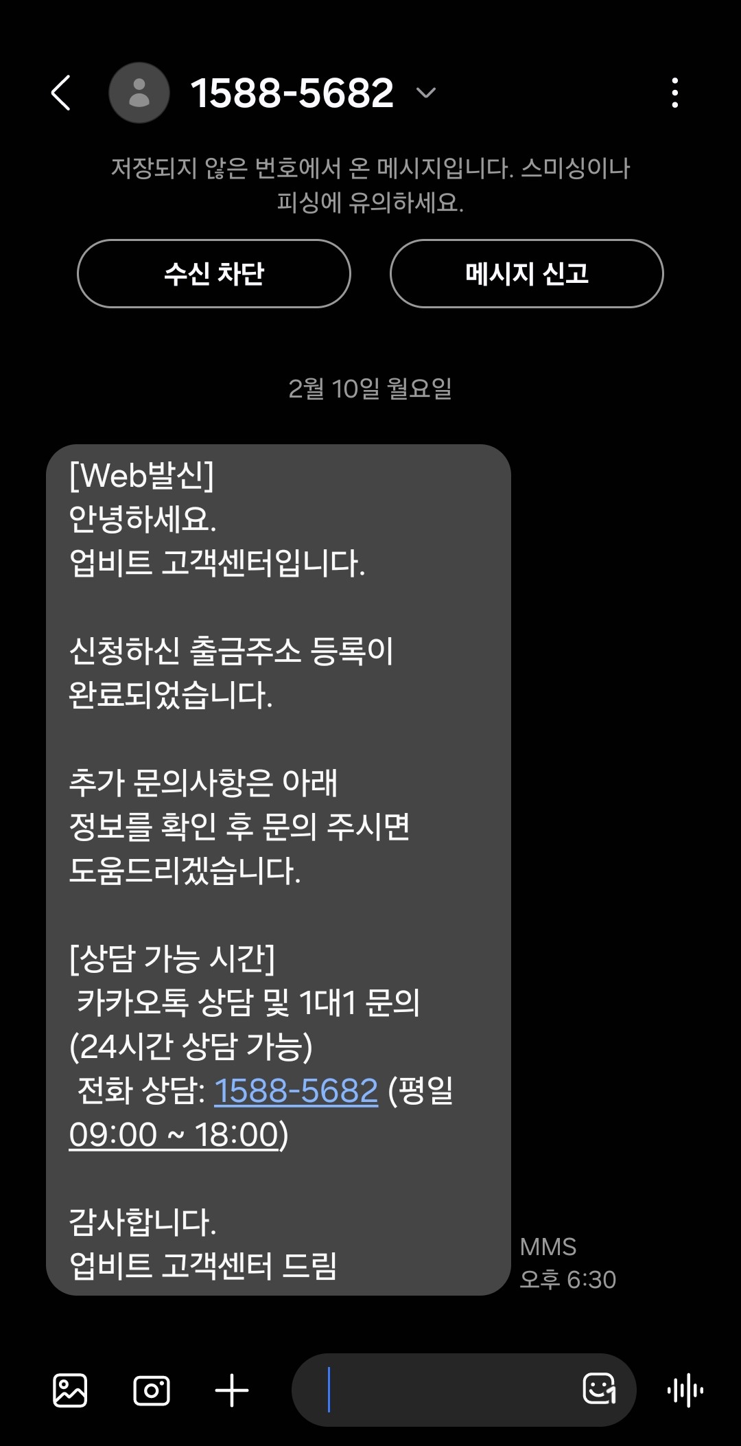 출금주소 등록이 완료되면 업비트는 '신청하신 출금주소 등록이 완료되었습니다.'라는 아래와 같은 메시지를 보내주더군요. 소요기간은 1-2일 정도 소요된 듯 합니다. 나이가 익어가니 기억이 가물가물....