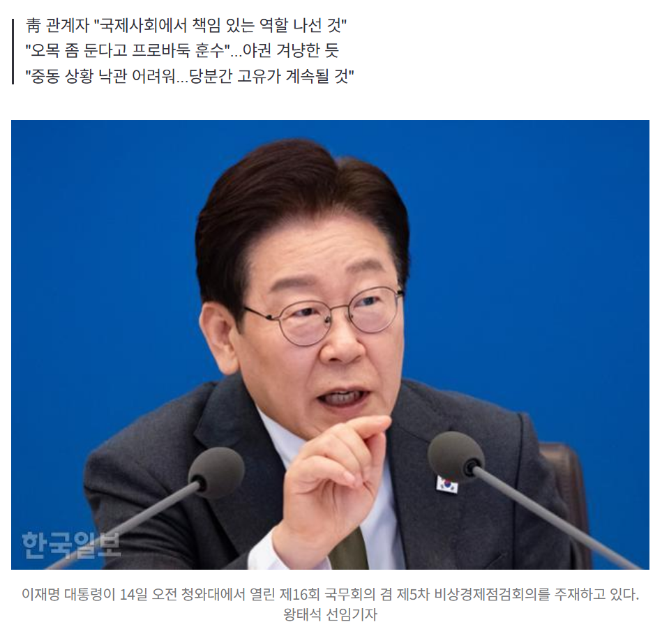 이 대통령은 이날 청와대에서 열린 국무회의 겸 제5차 비상경제점검회의에서 "지난 주말 진행된 중동전쟁 종전협상이 합의점을 제대로 못 찾는 것 같다"며 이같이 밝혔다. 제3국 간 전쟁이나 분쟁, 인권 침해 등에 침묵하거나 소극적 개입하는 데 그친 역대 대통령들과는 다른 행보다. 청와대 관계자는 "경제력과 국방력 등 여러 면에서 볼 때 이제 대한민국이 국제사회에서 책임 있는 역할을 해야 한다고 생각하는 이 대통령의 가치관이 드러난 발언"이라고 설명했다.