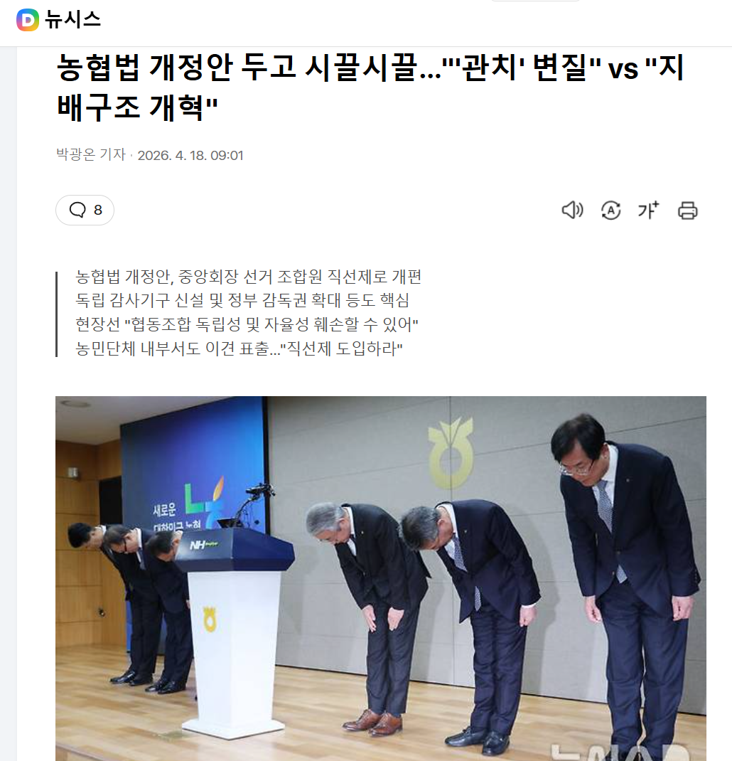 정부 관계자는 "농협이 공적 기능을 수행하는 만큼 일정 수준의 통제와 견제는 필요하다"며 "이번 개정안은 협동조합의 자율성을 훼손하기 위한 것이 아니라 오히려 신뢰를 회복하기 위한 구조 개편"이라고 강조했다.