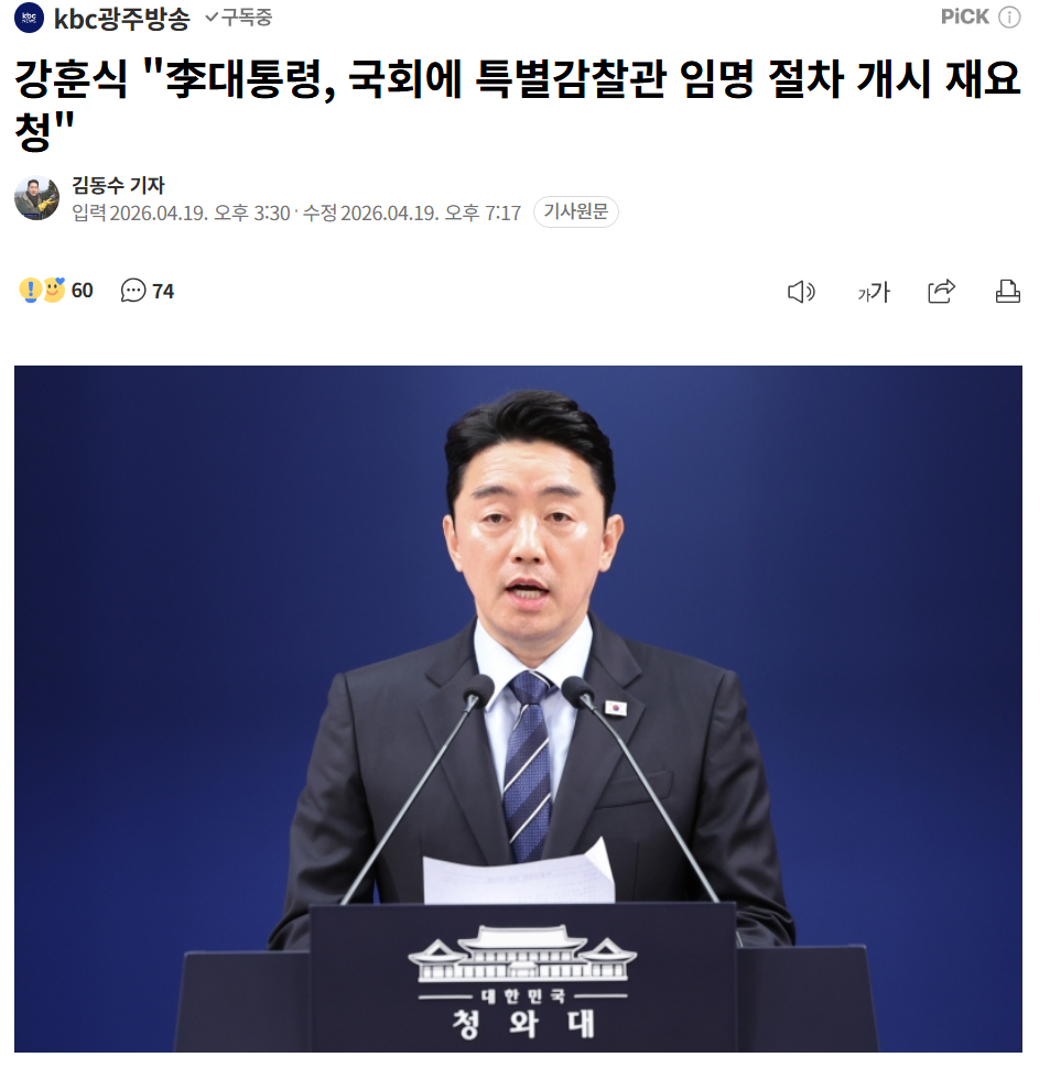 강훈식 대통령 비서실장은 이날 오후 청와대 춘추관에서 브리핑을 열고 "이 대통령은 공직 기강을 확립하고 국정운영 투명성을 제고하기 위해 국회가 특별감찰관 임명 절차를 개시해 줄 것을 다시 한번 요청했다"고 밝혔습니다.