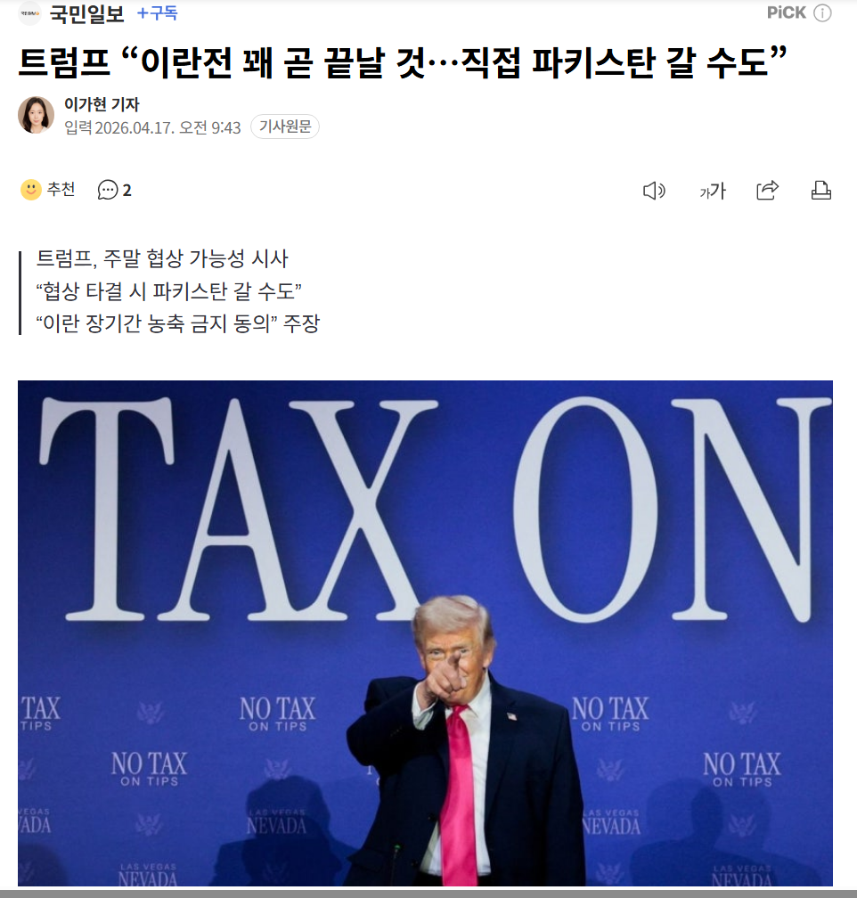 트럼프 “이란전 꽤 곧 끝날 것…직접 파키스탄 갈 수도”