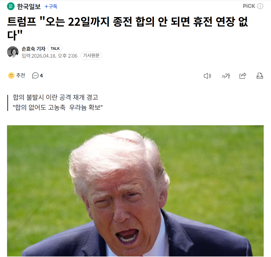 도널드 트럼프 미국 대통령이 이란과의 종전 협상 시한을 앞두고 휴전 종료와 군사행동 재개 가능성을 언급하며 압박 수위를 끌어올렸다.