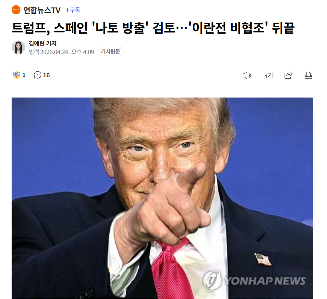 미국이 대이란 전쟁에서 군사 지원을 거부했다는 이유로 스페인을 북대서양조약기구(NATO·나토)에서 방출할지 검토 중이라고 로이터 통신이 보도했습니다.