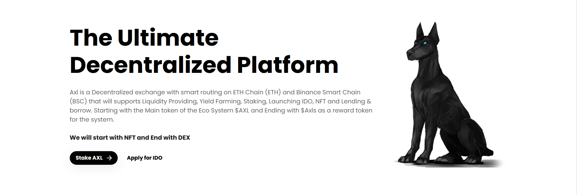 Interoperability: Interoperability is the strong point of the AXL DEX. We will fully support multi chain smart contract protocol through poly network. Currently, we support the Ethereum chain and Binance smart chain. Users with crypto assets on these platforms can carry out their trades without needing to switch from one chain to the other hence reducing costs of operations drastically. An added advantage is that if the user feels a particular Blockchain is not efficient enough, cross chain support makes it easy for the individual to switch to a different Blockchain that may be faster or may have lower transaction fees. After the staking concludes and the minting of our NFT characters are done, development of the decentralized exchange will begin in earnest.