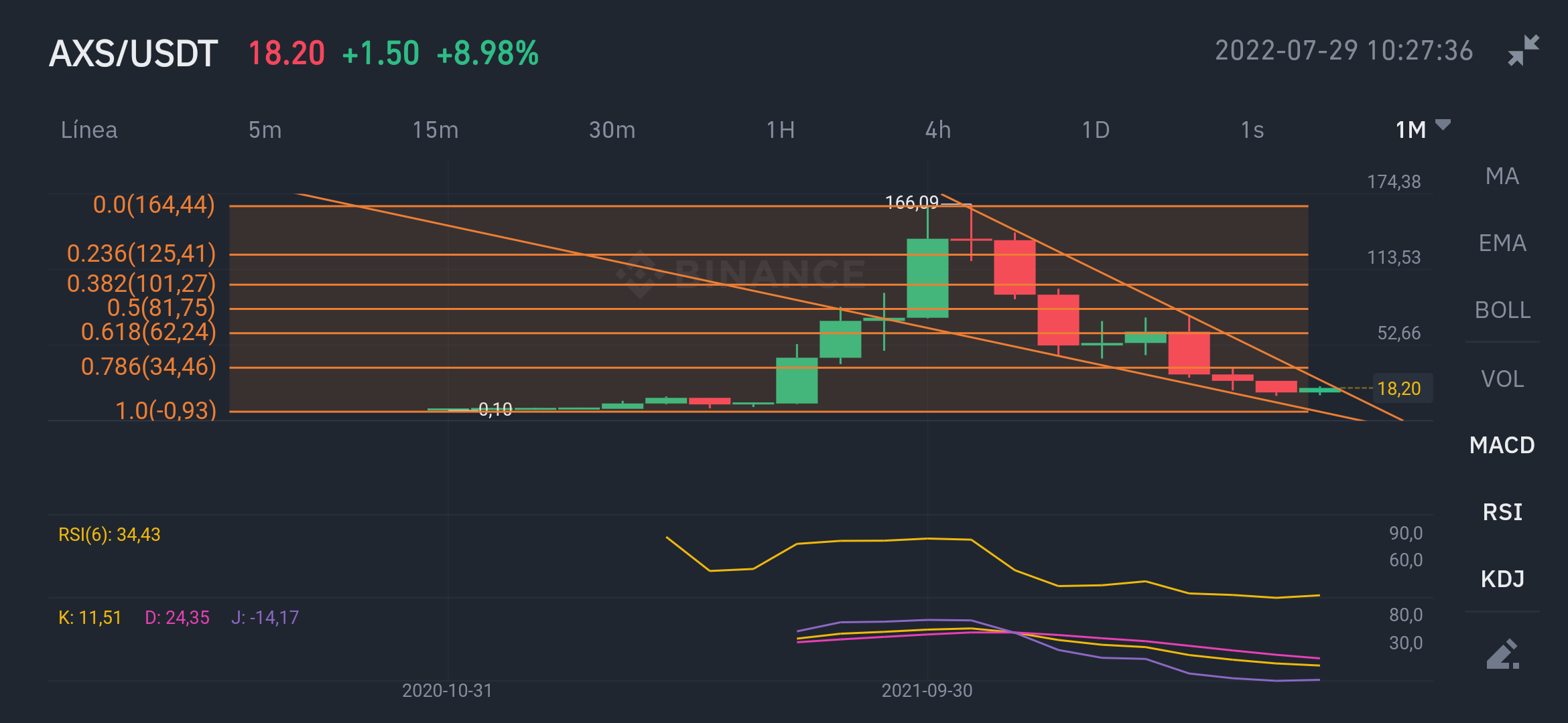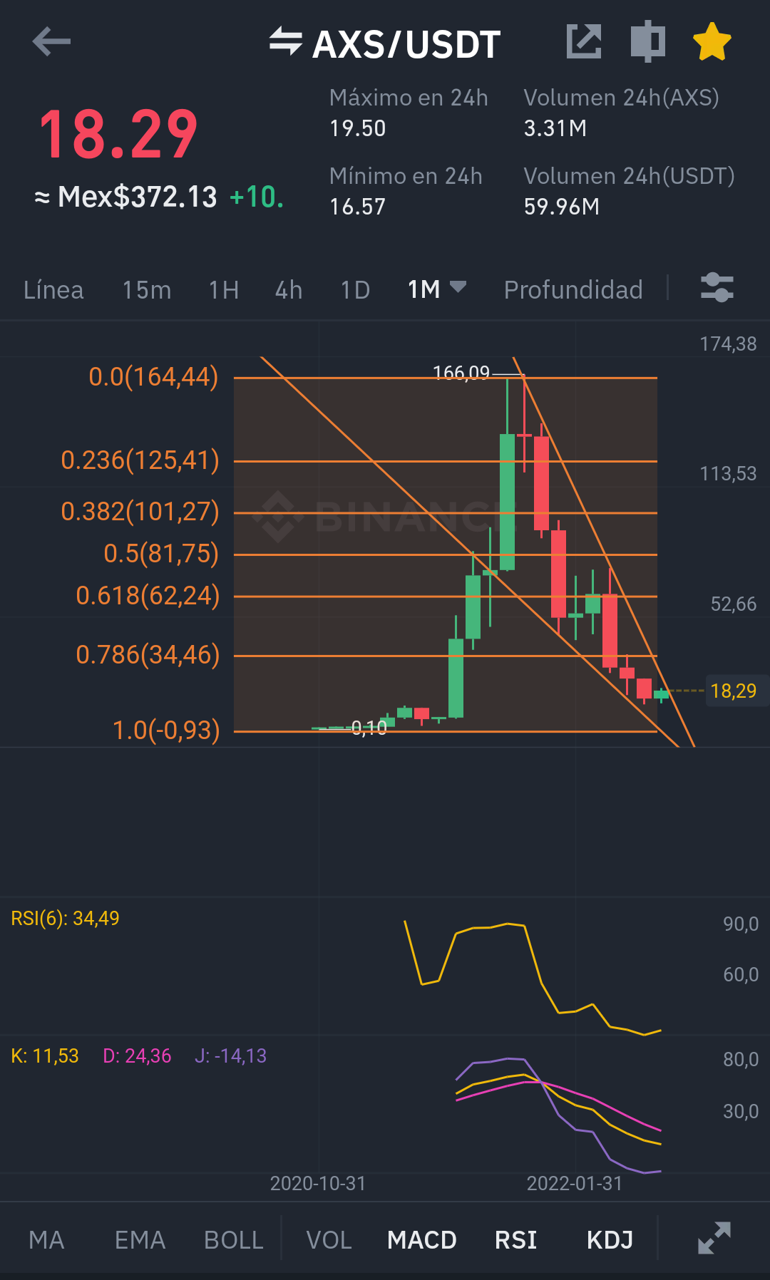 Utilizamos el indicador fibonacci tomando de referencia sus dos resistencias, combinado con el IRS, me hacen llegar a la conclusión de que el token esta sobrevendido y pronto podríamos ver un cambio de tendencia alcista.