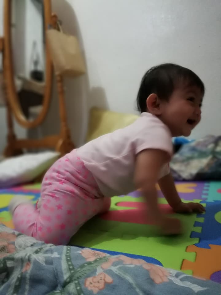 She has gotten the hang of crawling and gives us quite the trouble from time to time when we wake up to find her missing from the bed. She would usually just crawl all over the room and find things to play with without making any noise. I remember my wife almost getting the scare when she was lying next to her and looking all over the room frantically before spotting her in the corner. She even woke me up right away to tell me about it.