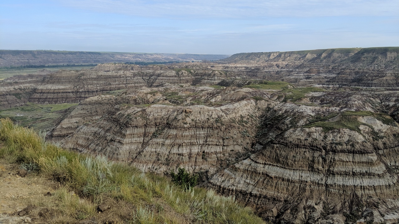 Layer upon layer of bentonite and coal and earthen soils. Originally this area was inhabited for Coal mining, but the unforgiving landscape holds many different kind of Sage Bush and flowers with crocuses in the spring. Larger tribes have been here. Some say only fool will stay. Fun to visit, but Canadian winters will suck all life out of here un-tell it wobbles the other way!