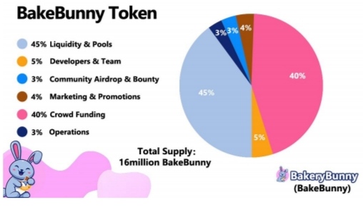 The platform has a native cryptocurrency referred to as BAKE, that is used for all transactions in the community. BAKE can be acquired by investors at pancakeswap with BNB. A total of 16 million tokens will be supplied to the project by management. It will be distributed in as stated below: