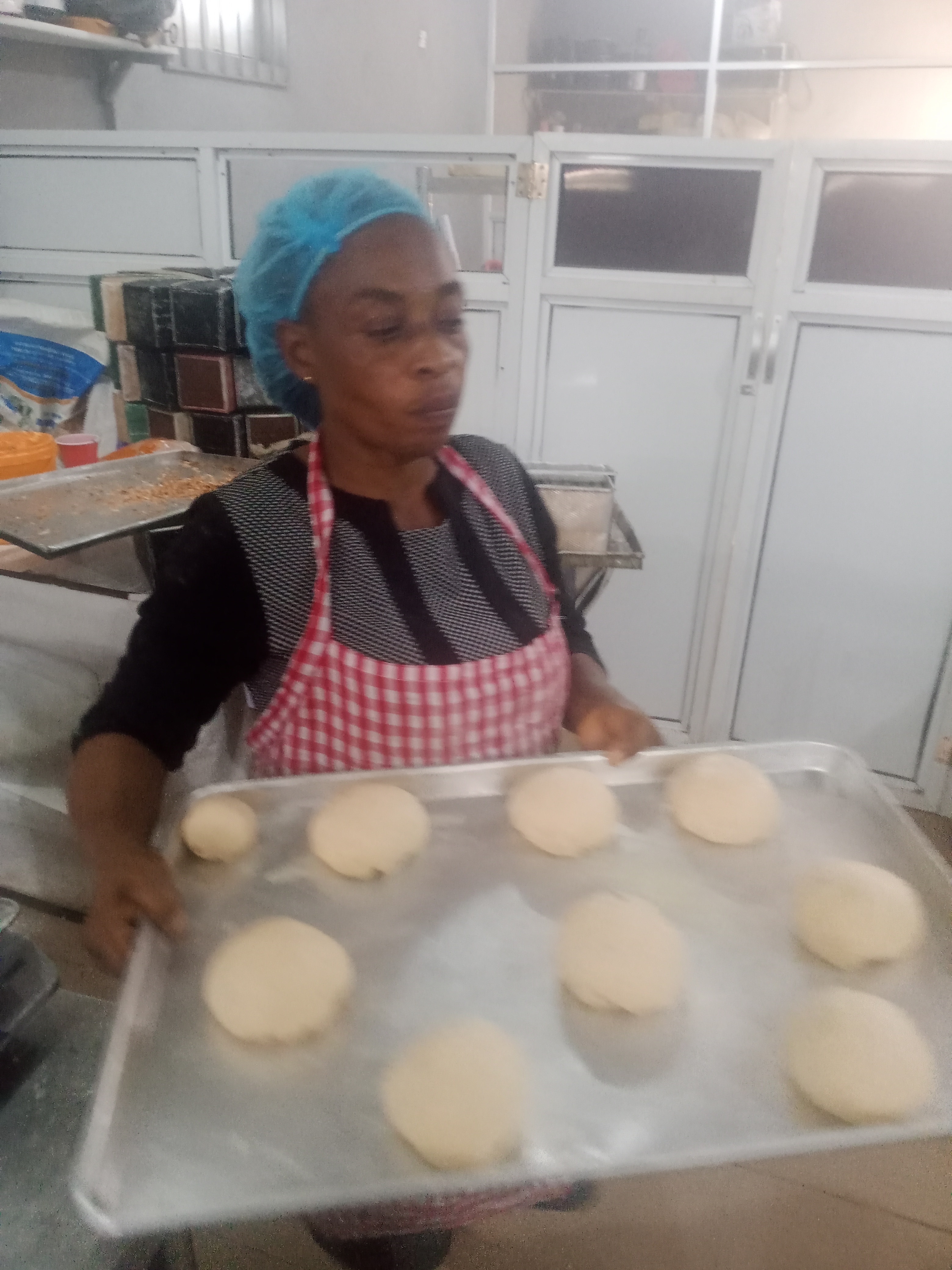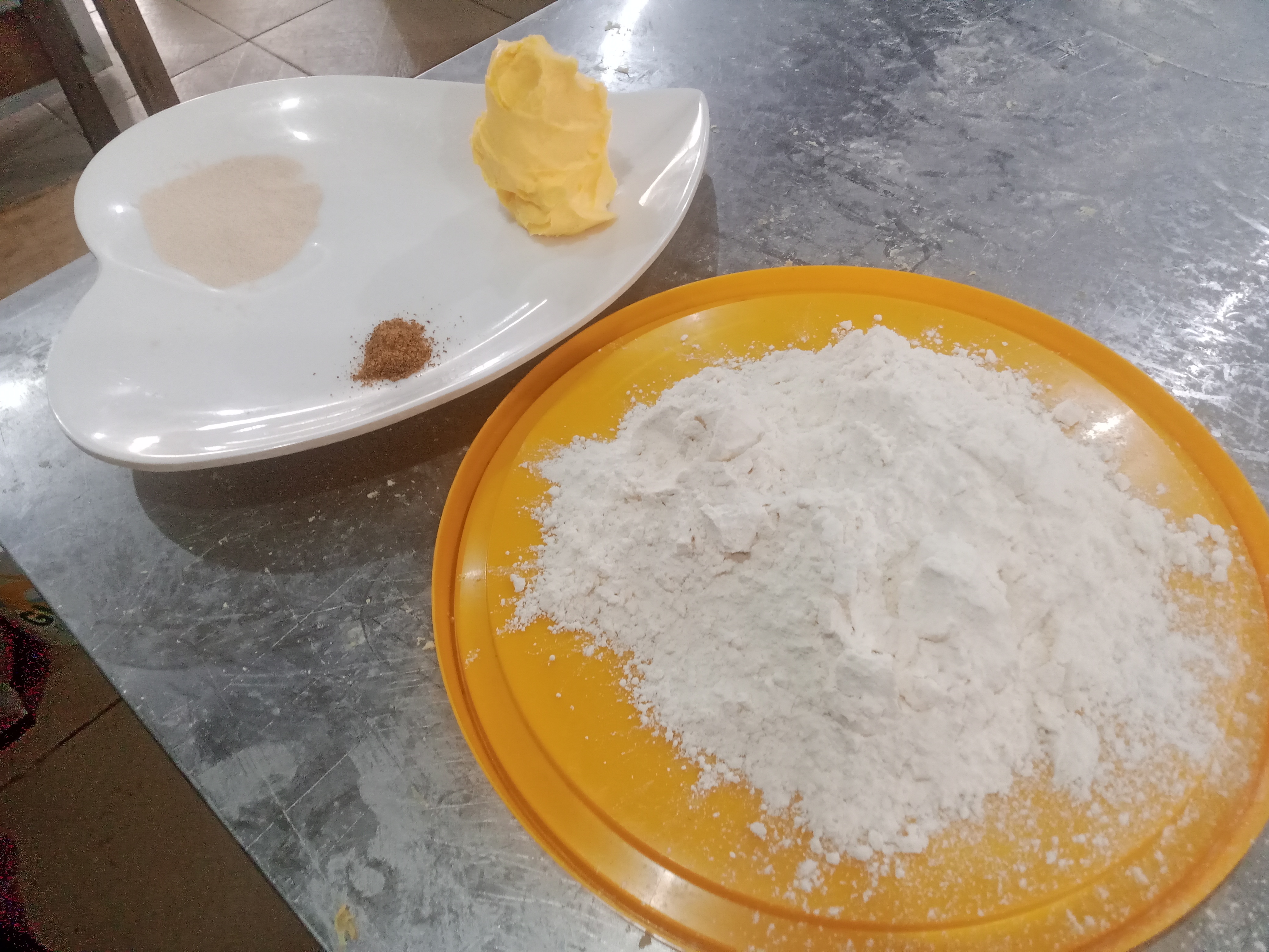 I washed my hands, covered my hair, and put on my apron, then l poured the flour into a mixing bowl and all dry ingredients:-sugar, nutmeg, salt, except yeast together and mix with dough mixer,,then add margarine,egg and cold water mix for 3 minutes and then add yeast knead for 7 minutes ,