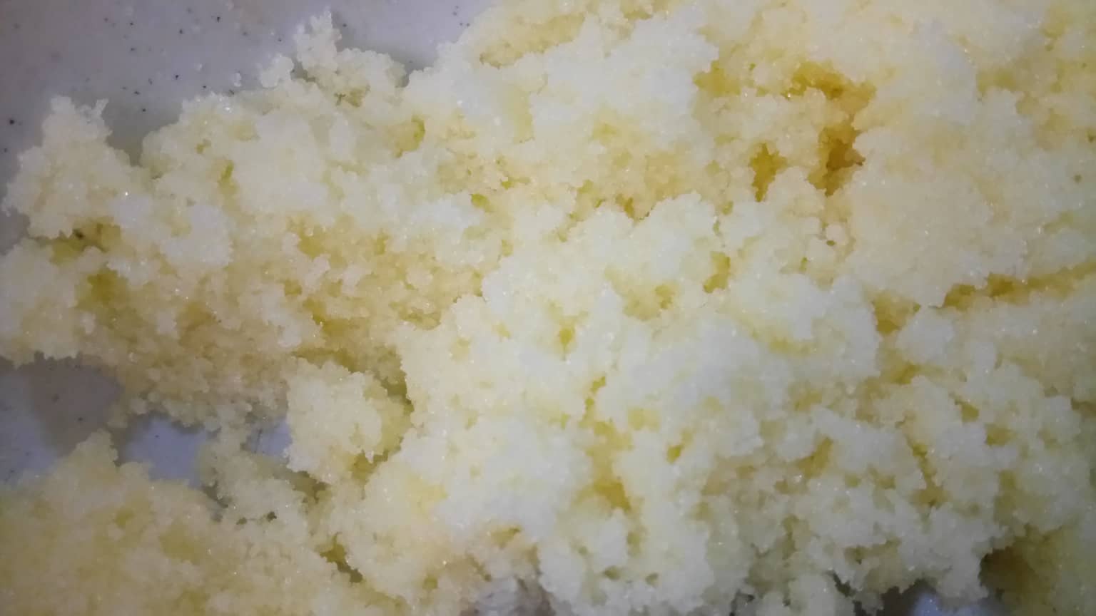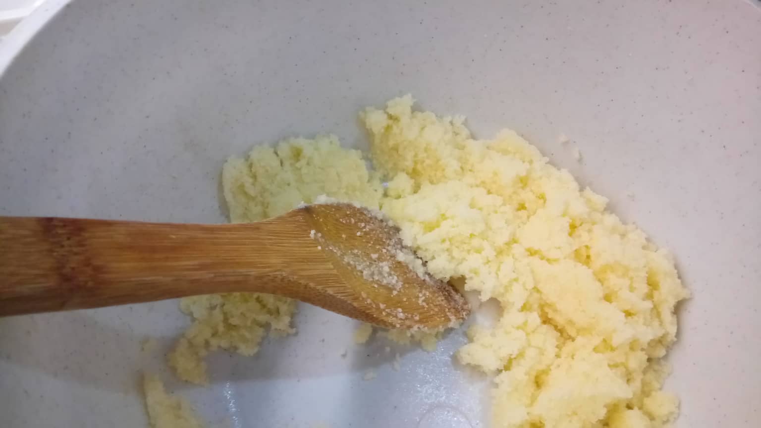 Mix sugar and butter (do not melt the butter and add it to sugar) until well mixed.