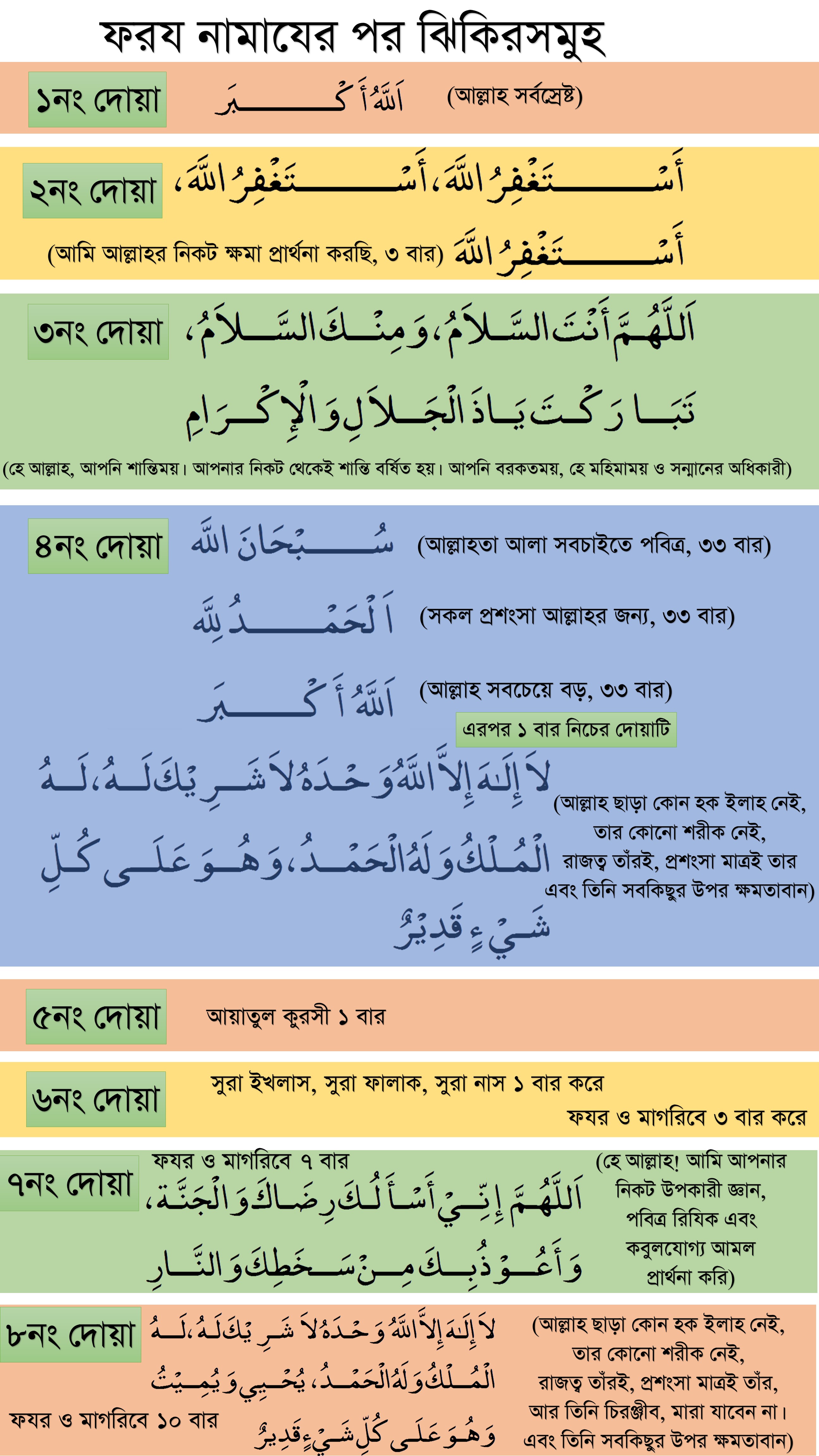 আলহামদুলিল্লাহ, ফরয নামাযের পরের দোয়াগুলোকে এক জায়গায় এনে দুইটি ছবিতে নিয়ে আসতে পেরেছি। আশা করি এই দুইটি ছবি মুসলিম বন্ধুদের অনেক উপকারে আসবে। ধন্যবাদ।